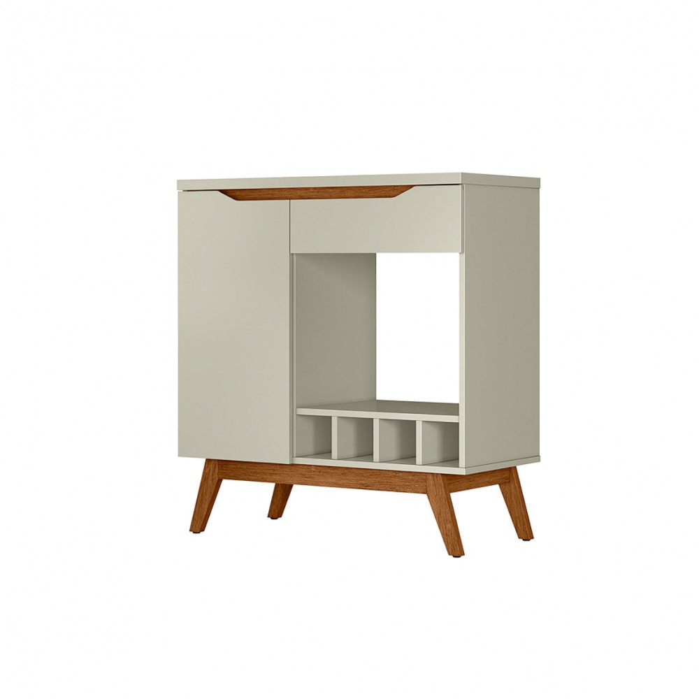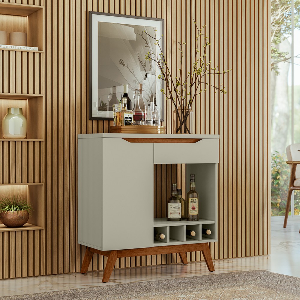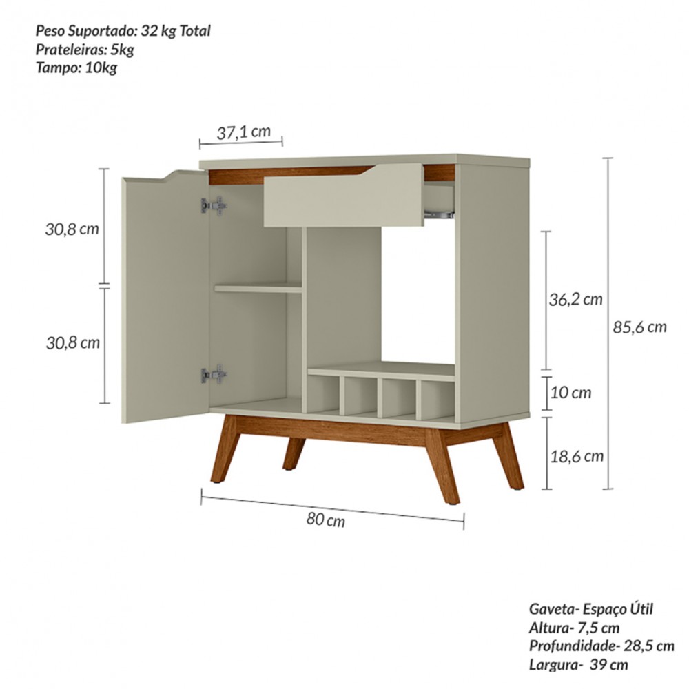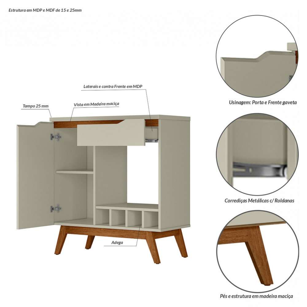 O Aparador Retrô Adega Tóquio, possui o tampo de 25 mm. A porta e a gaveta possuem usinagem que serve como puxadores, as dobradiças e corrediças são metálicas. Possui também uma adega para 04 garrafas de vinho, e mais um compartimento aberto para colocar objetos para seu barzinho. Os pés são chassi envernizado, um produto ótimo que serve para você colocar em um ambiente como aparador e ao mesmo tempo como um buffet com adega.