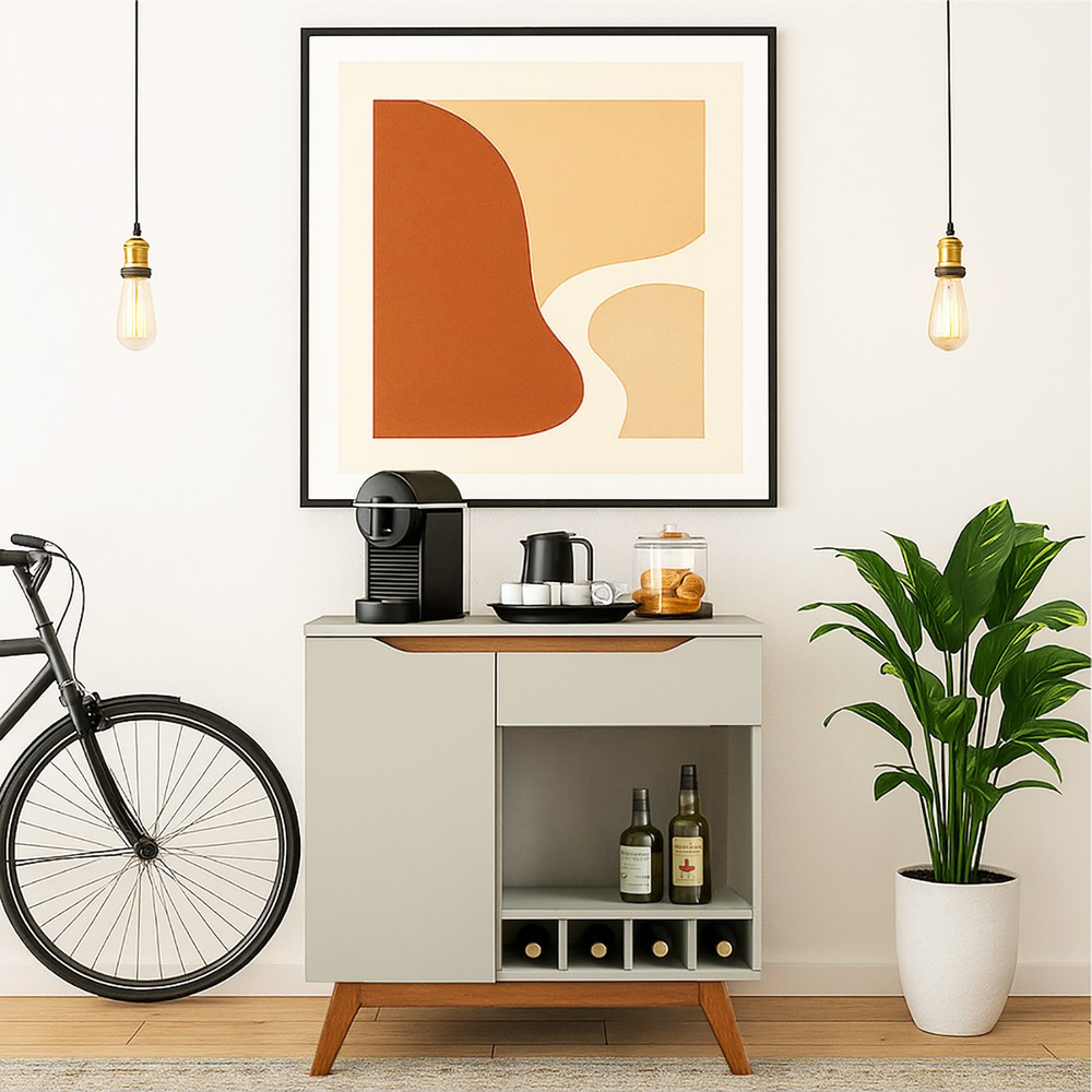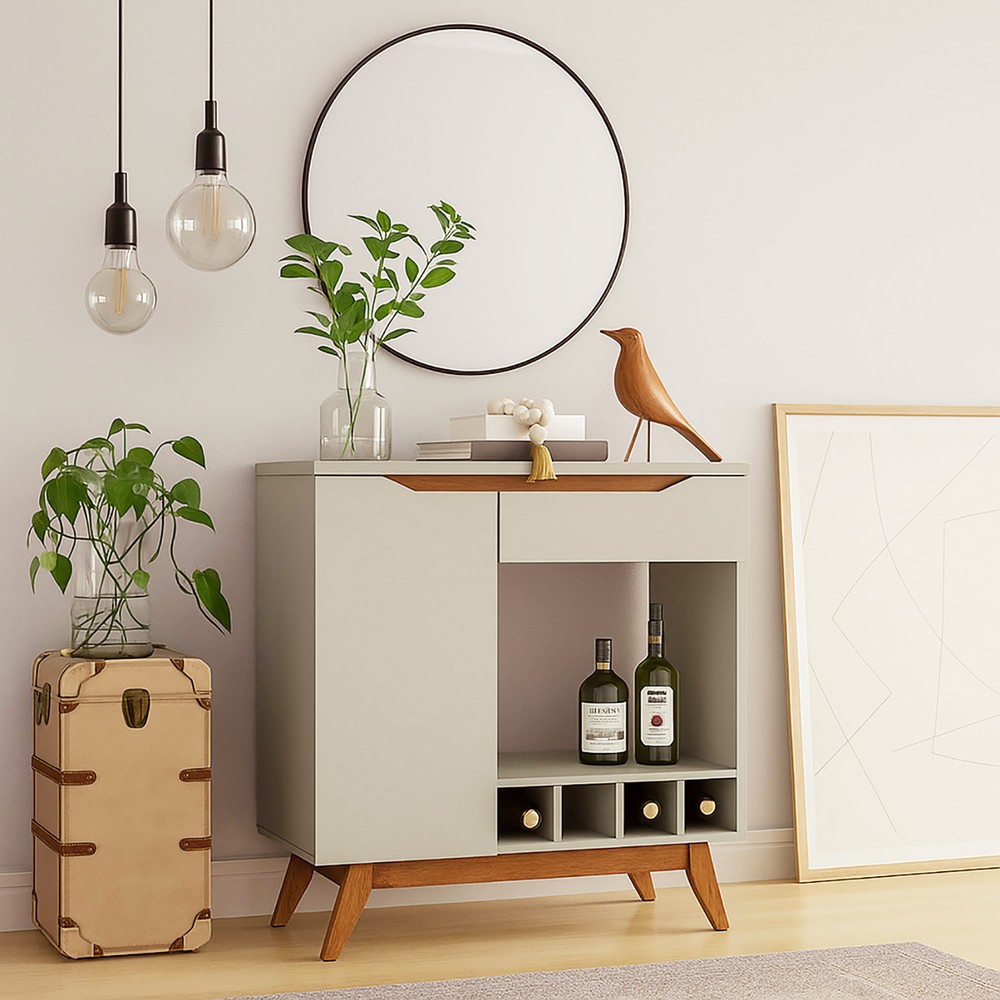 O Aparador Retrô Adega Tóquio, possui o tampo de 25 mm. A porta e a gaveta possuem usinagem que serve como puxadores, as dobradiças e corrediças são metálicas. Possui também uma adega para 04 garrafas de vinho, e mais um compartimento aberto para colocar objetos para seu barzinho. Os pés são chassi envernizado, um produto ótimo que serve para você colocar em um ambiente como aparador e ao mesmo tempo como um buffet com adega.