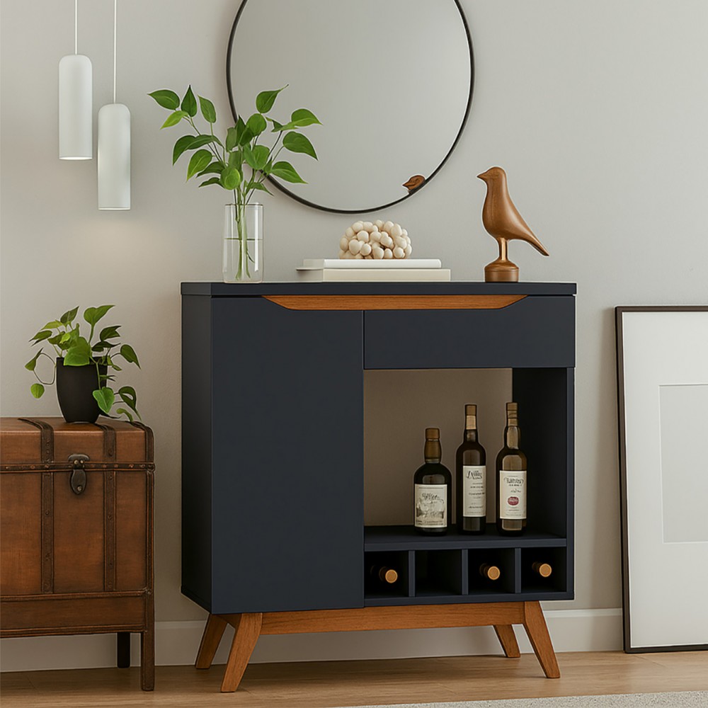 O Aparador Retrô Adega Tóquio, possui o tampo de 25 mm. A porta e a gaveta possuem usinagem que serve como puxadores, as dobradiças e corrediças são metálicas. Possui também uma adega para 04 garrafas de vinho, e mais um compartimento aberto para colocar objetos para seu barzinho. Os pés são chassi envernizado, um produto ótimo que serve para você colocar em um ambiente como aparador e ao mesmo tempo como um buffet com adega.
