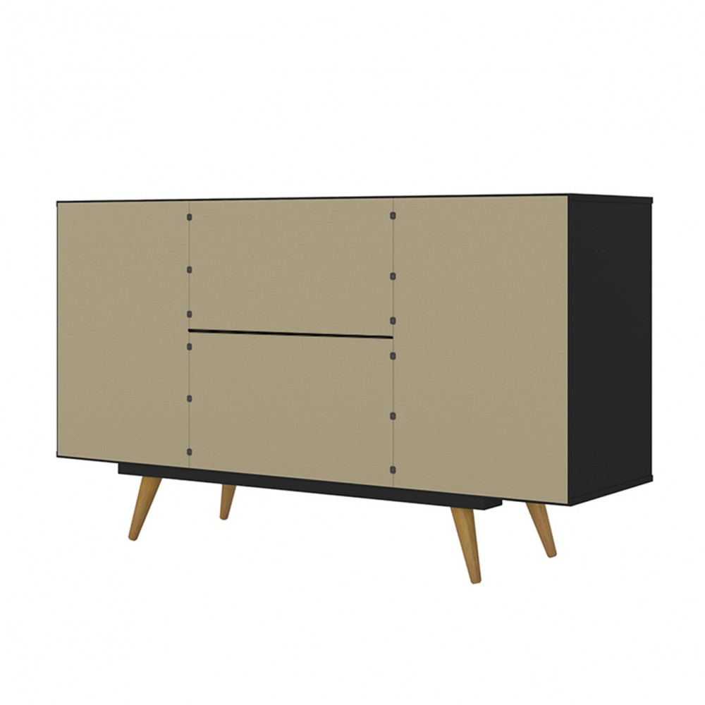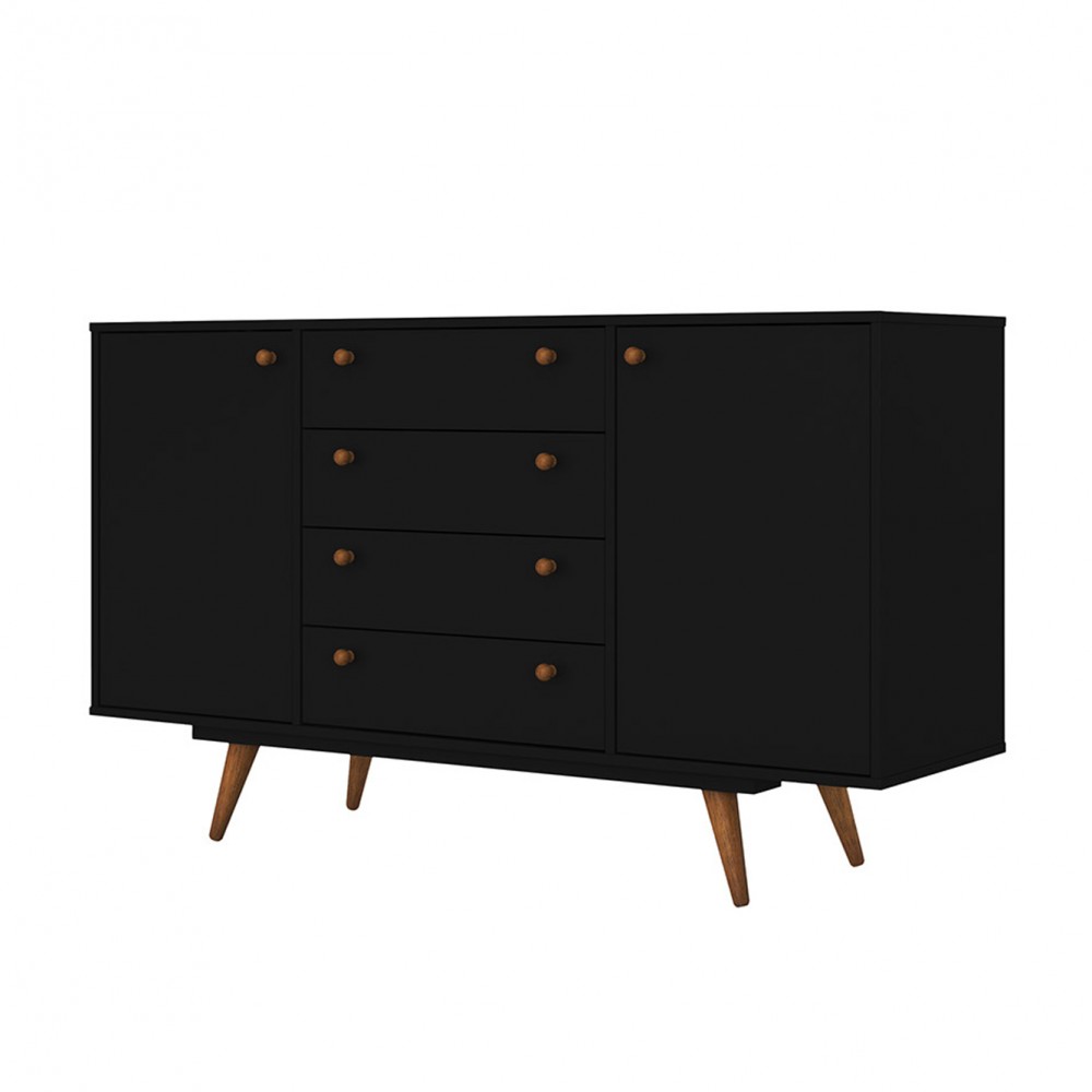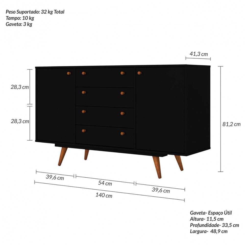 O Buffet Retrô Califórnia é um móvel com uma linha retrô que você poderá colocar na sua sala de jantar ou em outro ambiente qualquer. Tem como diferencial seus puxadores e seus pés em madeira no formato palito. Possui duas portas de rotação com dobradiças metálicas, duas prateleiras internas e quatro gavetas com corrediças deslizantes metálicas.