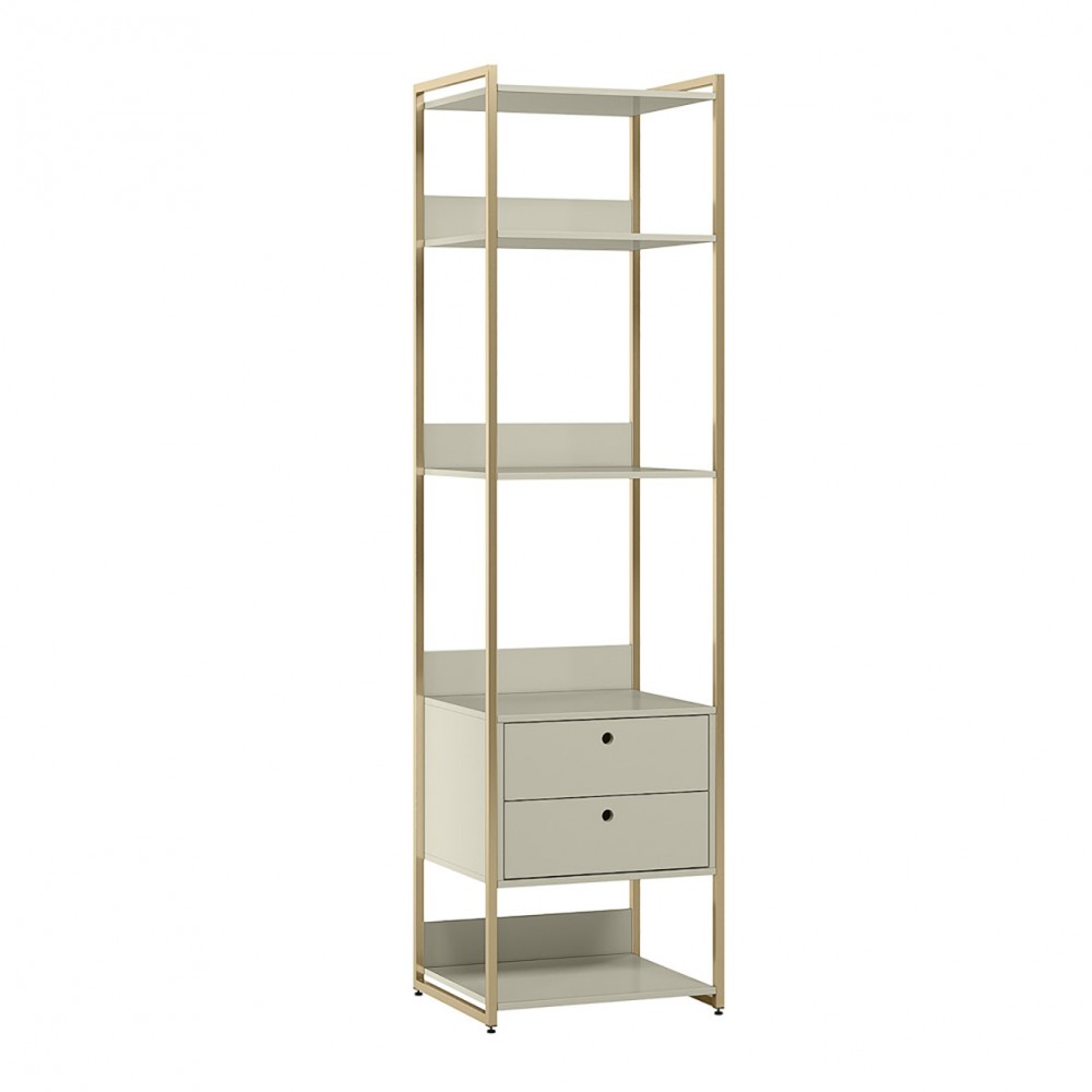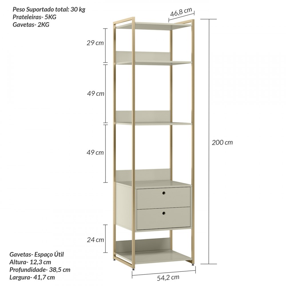O Closet Estante Ind. Olivar-Módulo 03 é um produto que mostra uma diversidade de materiais, com metal nas laterais e MDF e MDP de 15 mm. Ele possui 5 prateleiras para acomodar objetos ou roupas, duas gavetas com corrediças metálicas, um detalhe usinado na frente da gaveta para servir como puxador e pés reguláveis.