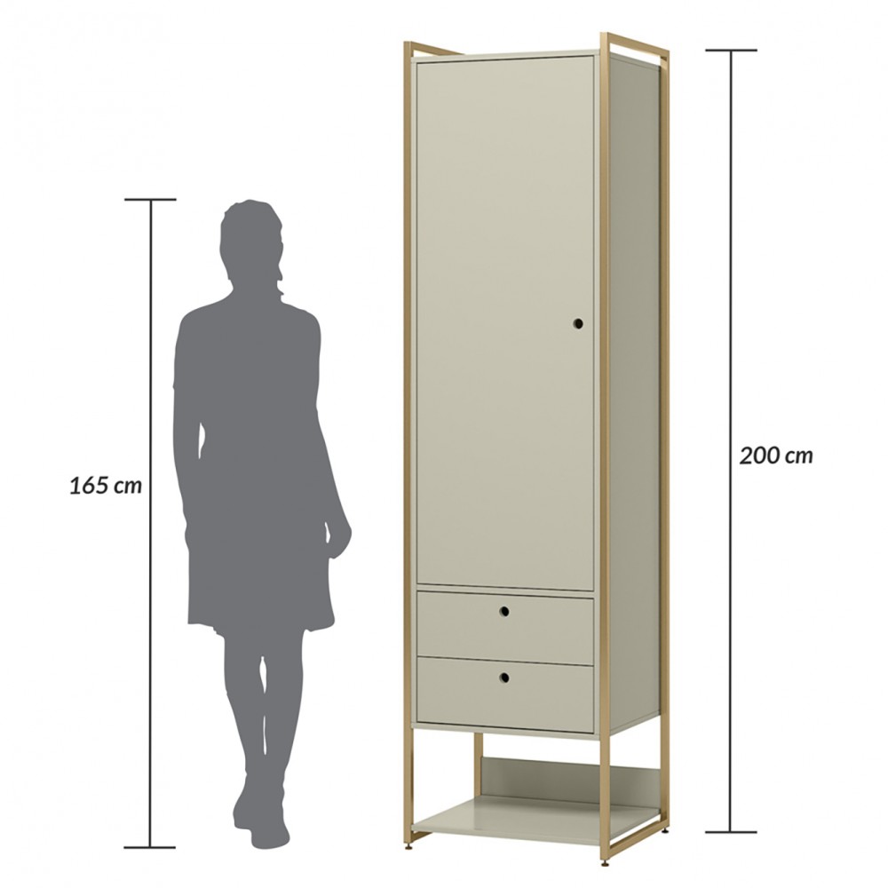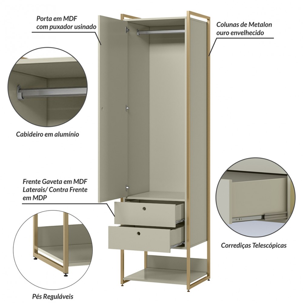 O Closet Ind. Olivar-Módulo 04 é um produto que mostra uma diversidade de materiais, com metal nas laterais e MDF e MDP de 15 mm. Ele possui 2 prateleiras para acomodar objetos ou roupas, um cabideiro de alumínio, duas gavetas com corrediças metálicas, uma porta com dobradiças metálicas, um detalhe usinado na frente da gaveta e porta para servir como puxadores e pés reguláveis.