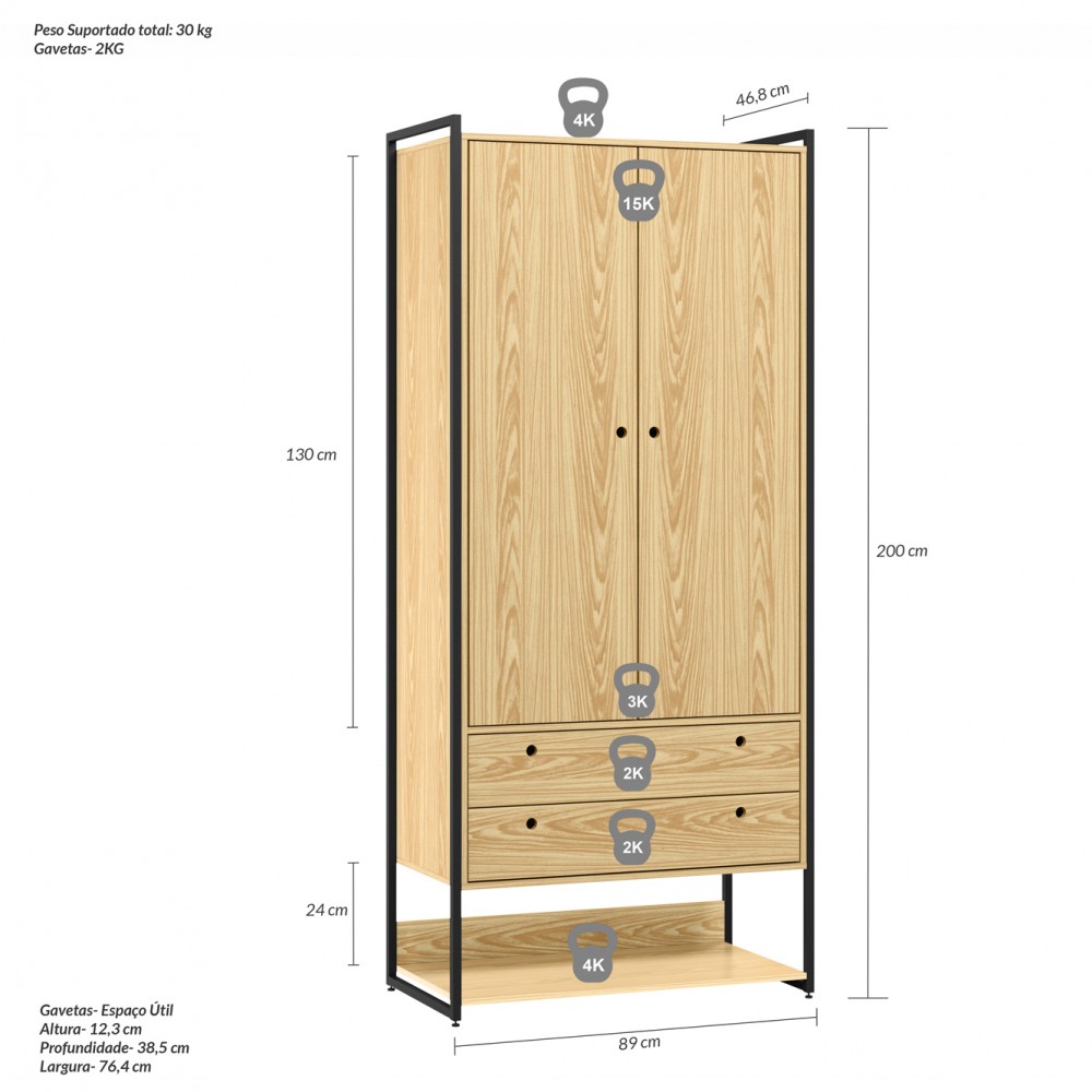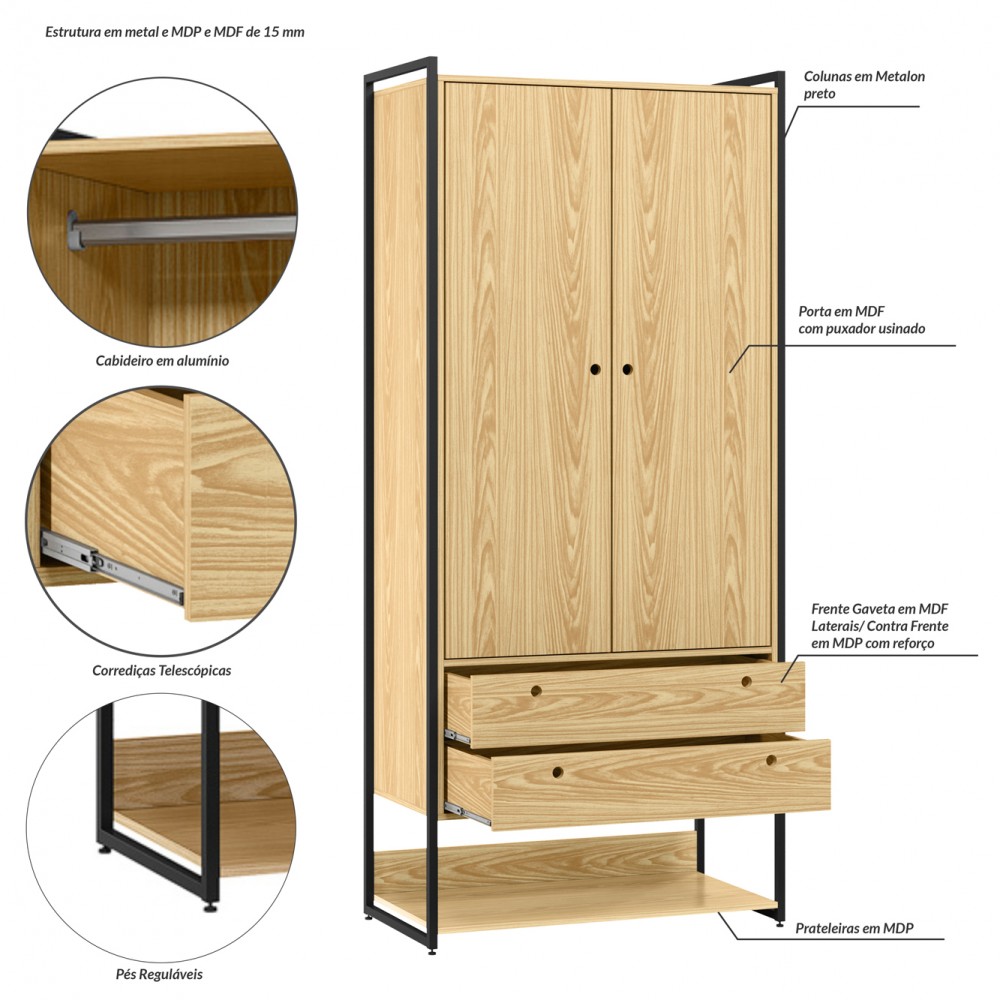 O Closet Ind. Olivar-Módulo 05 é um produto que mostra uma diversidade de materiais, com metal nas laterais e MDF e MDP de 15 mm. Ele possui 1 prateleira para acomodar objetos, calçados ou roupas, duas portas e um cabideiro de alumínio, duas gavetas com corrediças telescópicas, um detalhe usinado na frente da gaveta e das portas para servir como puxador e possui pés reguláveis para facilitar nos desníveis dos pisos. Este produto é ideal para quarto que poderá também juntar-se com outros módulos da Olivar Móveis e montar um Closet maior onde irão acomodar tudo que você precisa. É um produto com design de uma pegada industrial para quem gosta do estilo mais urbano e contemporâneo onde você personaliza seu ambiente deixando-o exclusivo.