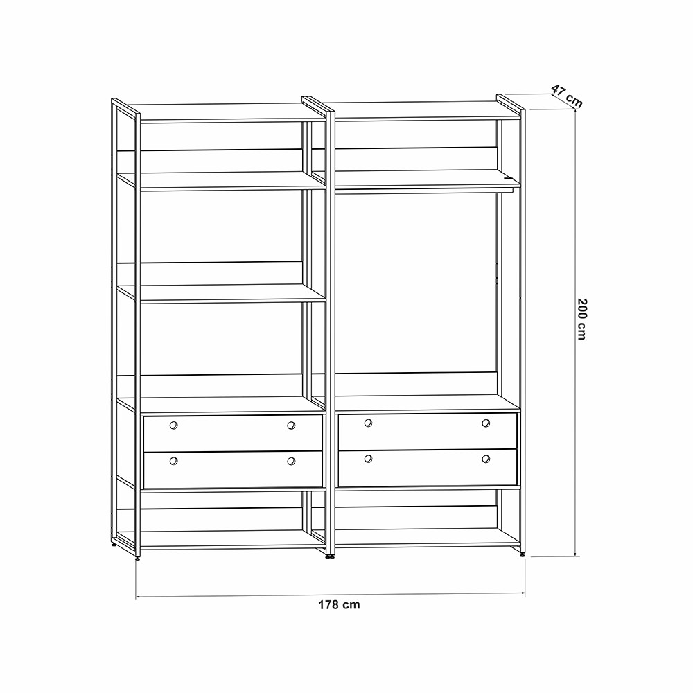 Este é o Conjunto de Closet Ind. Olivar-Módulos 01 e 02, produto que mostra uma diversidade de materiais, com metal nas laterais, MDF e MDP de 15 mm. Ele possui prateleiras para acomodar objetos ou roupas, 1 cabideiro de metal, gavetas com corrediças metálicas, tudo com design de uma pegada industrial para quem gosta do estilo mais urbano e contemporâneo onde você personaliza seu ambiente deixando-o exclusivo.