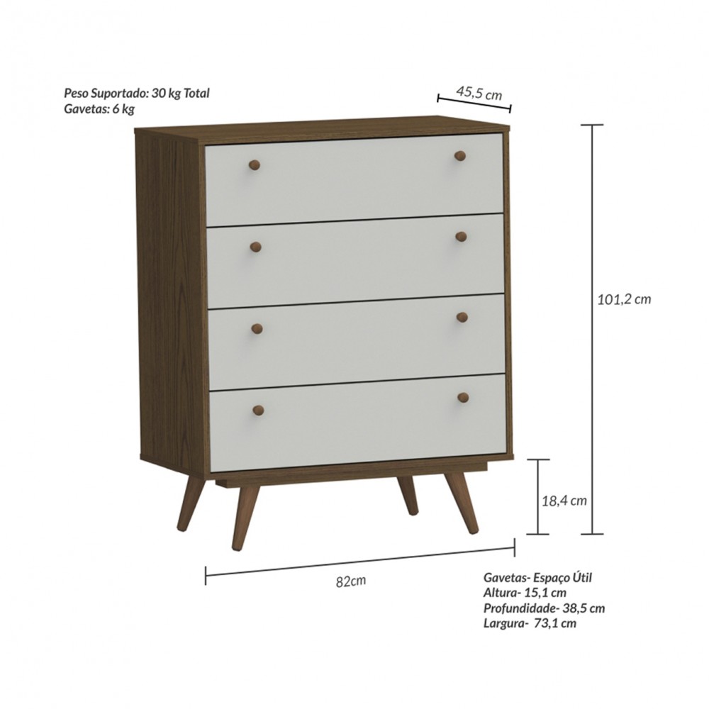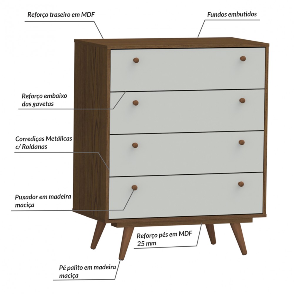 A Cômoda Retrô 35 possui um design do retrô ao contemporâneo deixando o ambiente sofisticado. Possui quatro gavetas amplas e deslizantes com reforço.