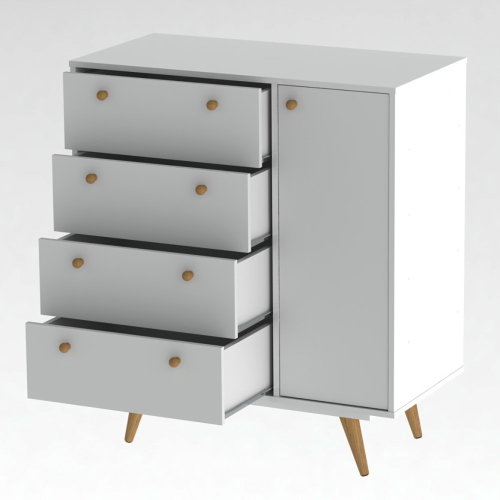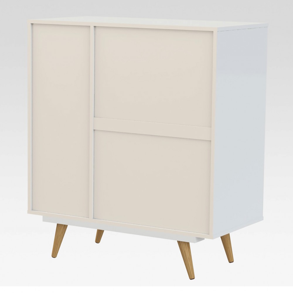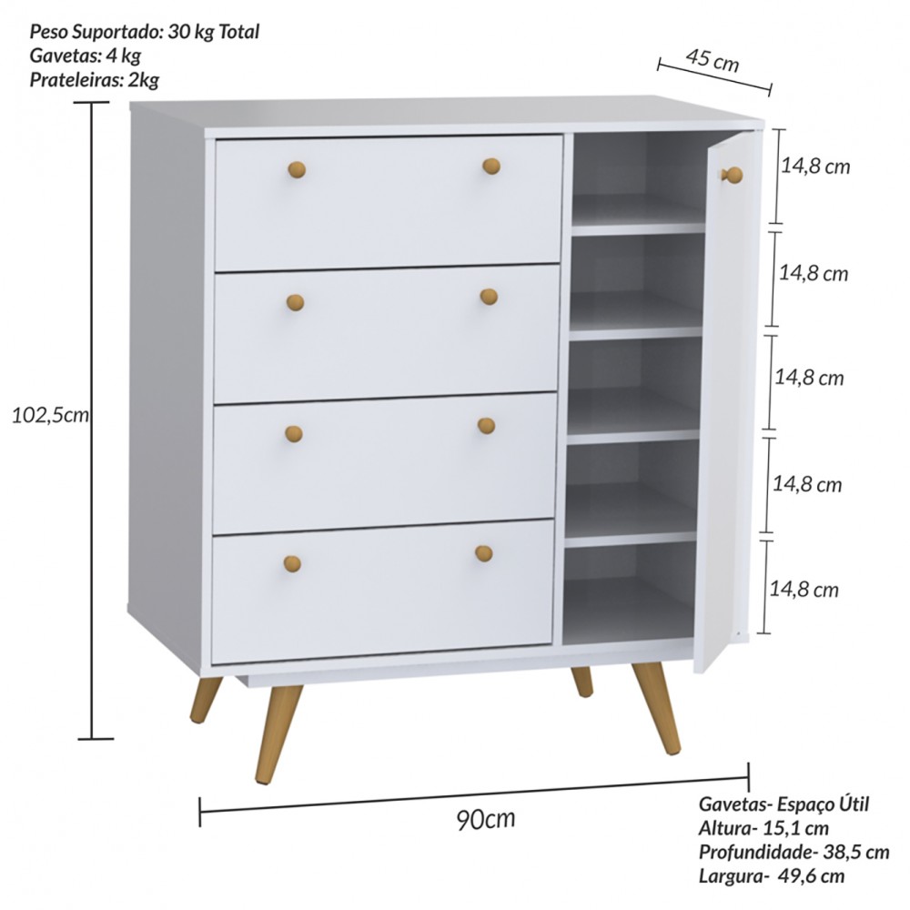 A Cômoda Sapateira Retrô 30 possui um design do retrô ao contemporâneo deixando o ambiente sofisticado. É um móvel muito útil, possui quatro gavetas deslizantes com reforço, uma porta de rotação com cinco compartimentos para colocar 10 pares de calçados, objetos, livros ou materiais escolares.