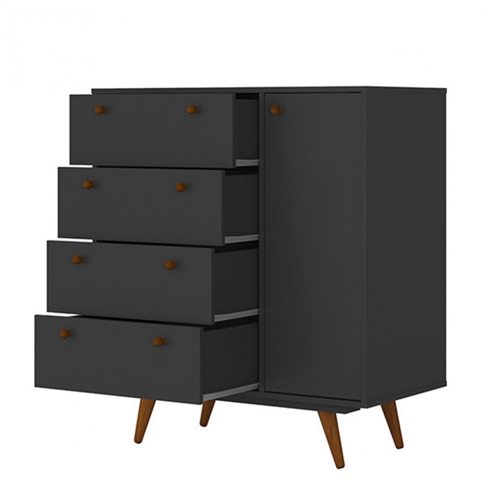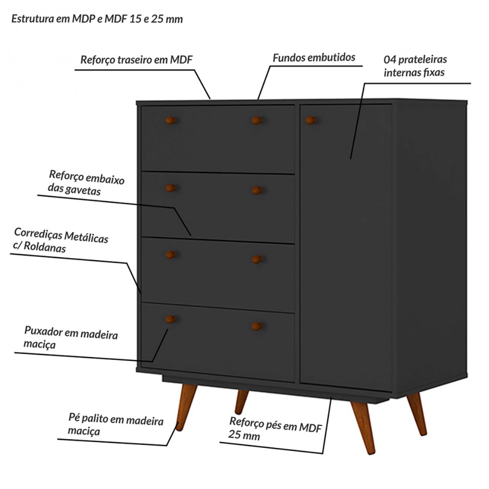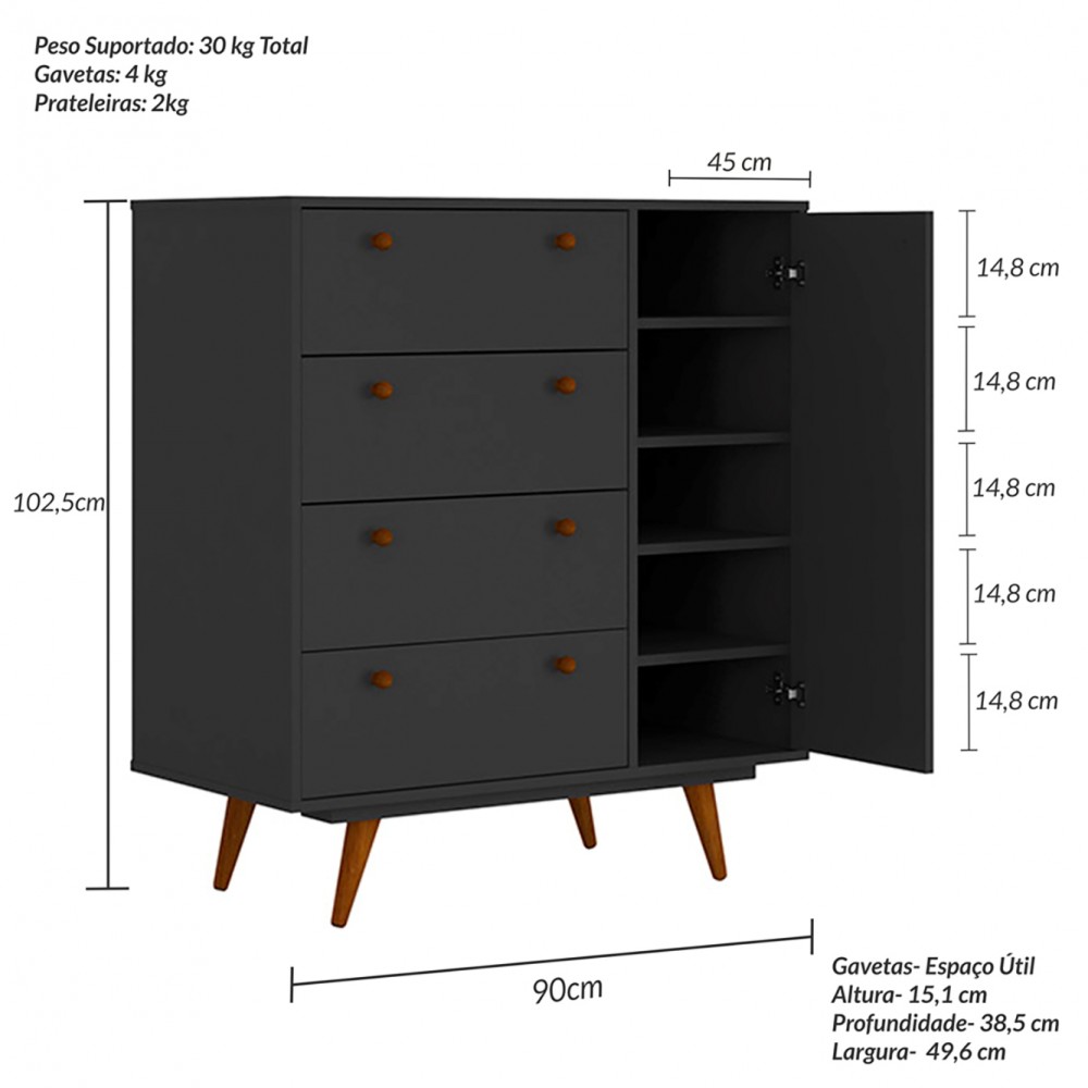 A Cômoda Sapateira Retrô 30 possui um design do retrô ao contemporâneo deixando o ambiente sofisticado. É um móvel muito útil, possui quatro gavetas deslizantes com reforço, uma porta de rotação com cinco compartimentos para colocar 10 pares de calçados, objetos, livros ou materiais escolares.