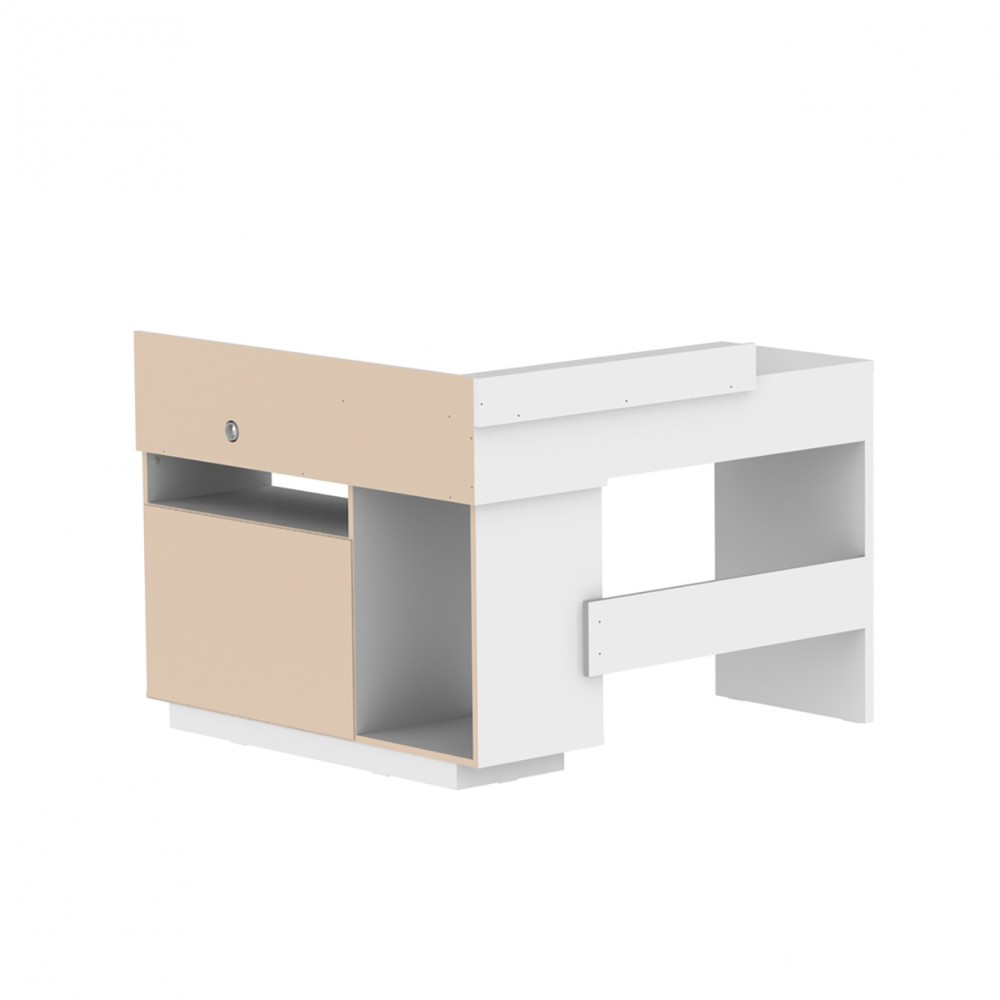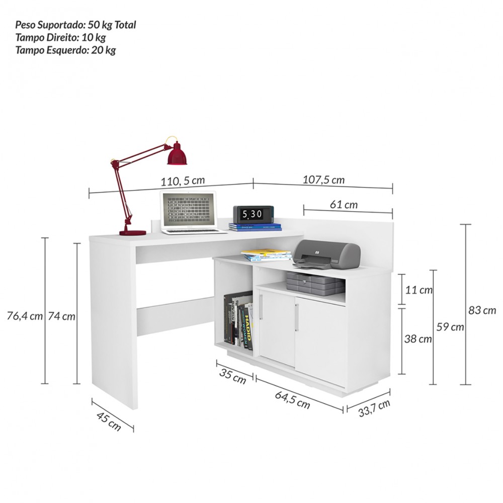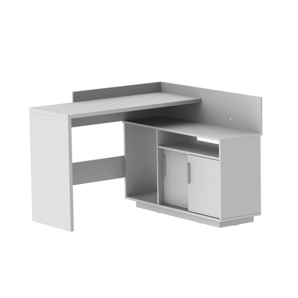 Escrivaninha de Canto ampla e funcional, possui compartimentos abertos e fechados c/ duas portas deslizantes para acomodação de diversos objetos, possui duas prateleiras sendo uma interna móvel e uma externa fixa. Espaço para notebook, impressora e outros.