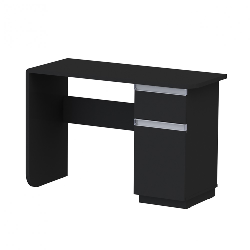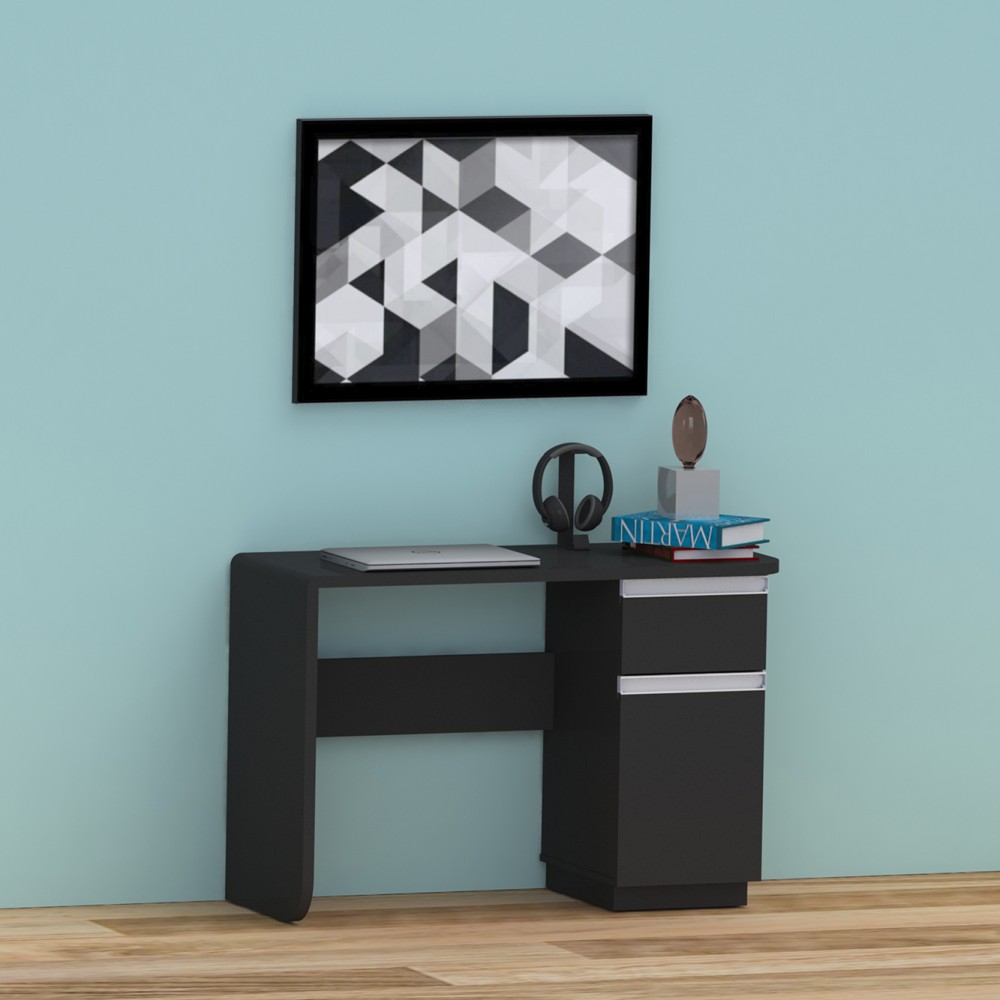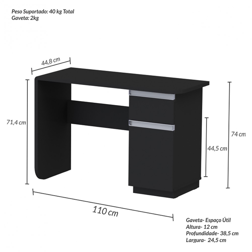 Escrivaninha funcional ótima para trabalhar também com notebook, o diferencial dela é o tampo e a lateral em MDF com cantos arredondados. Possui uma gaveta e um compartimento fechado com espaços para guardar objetos, livros e outros.