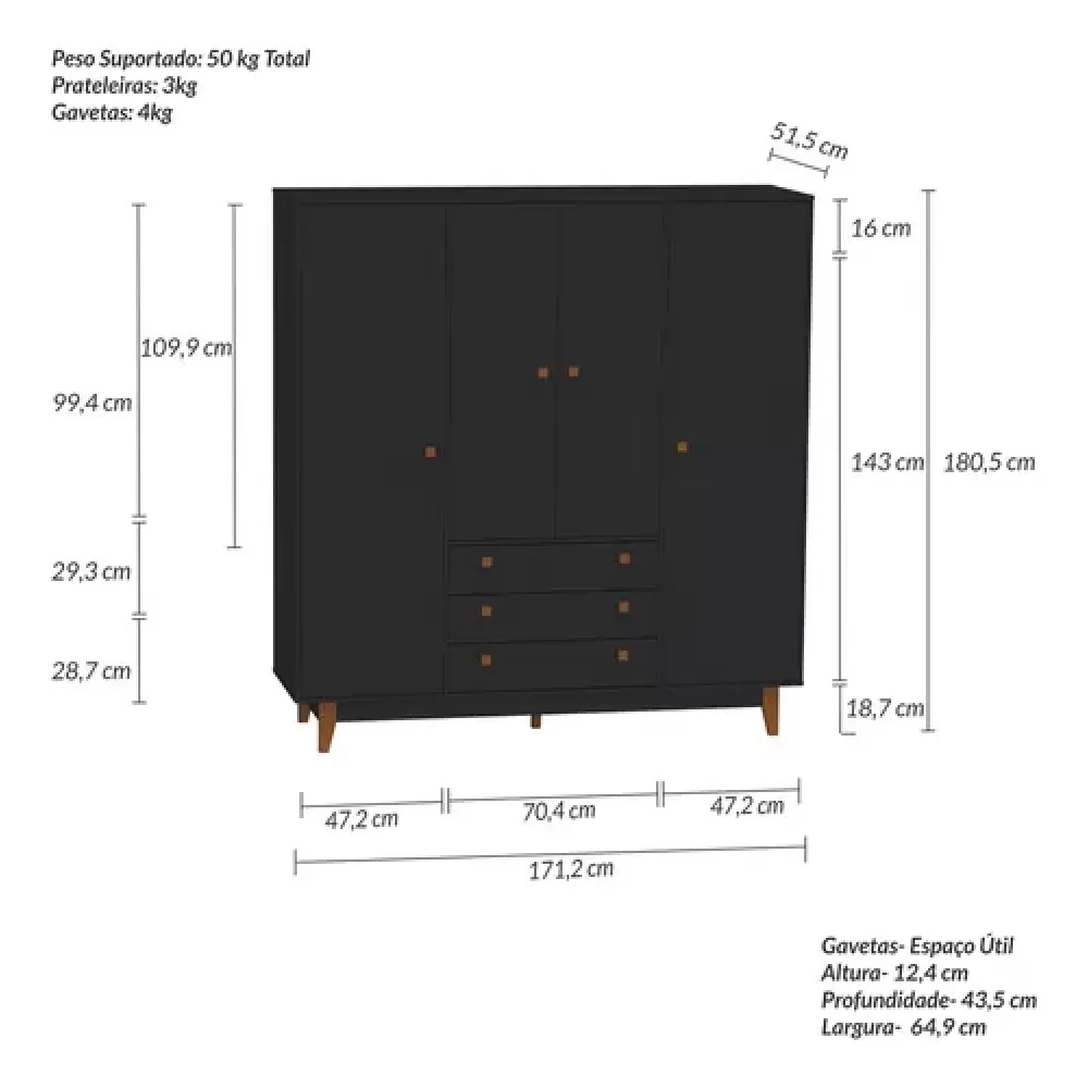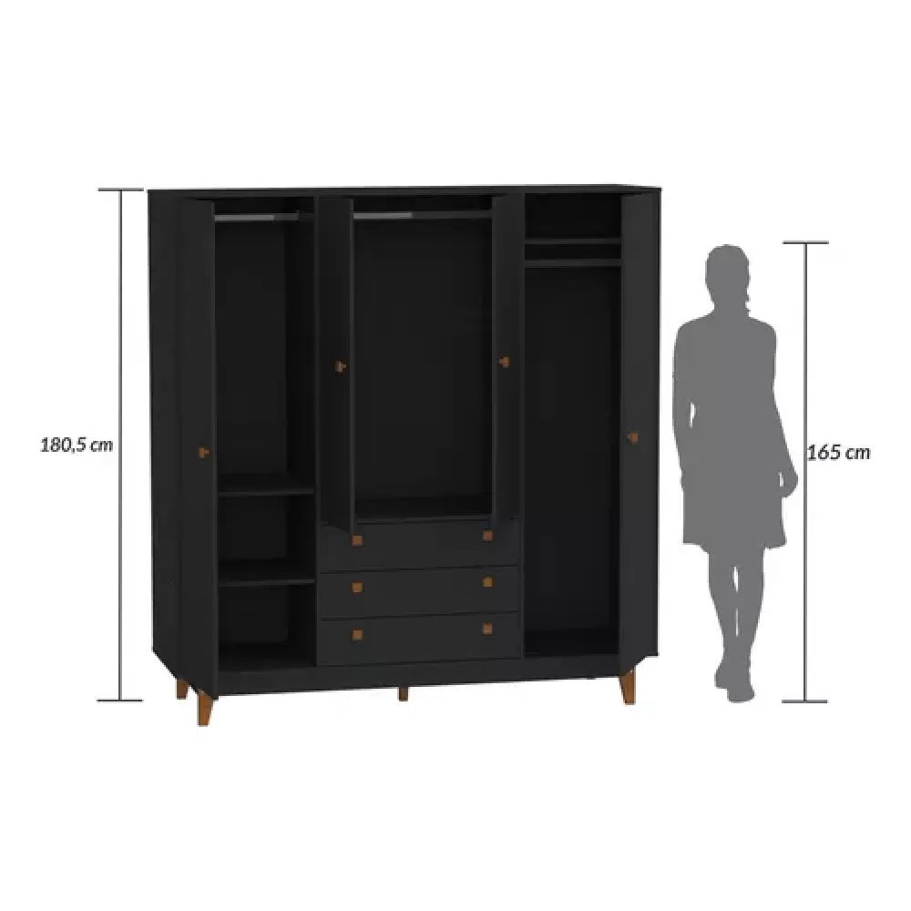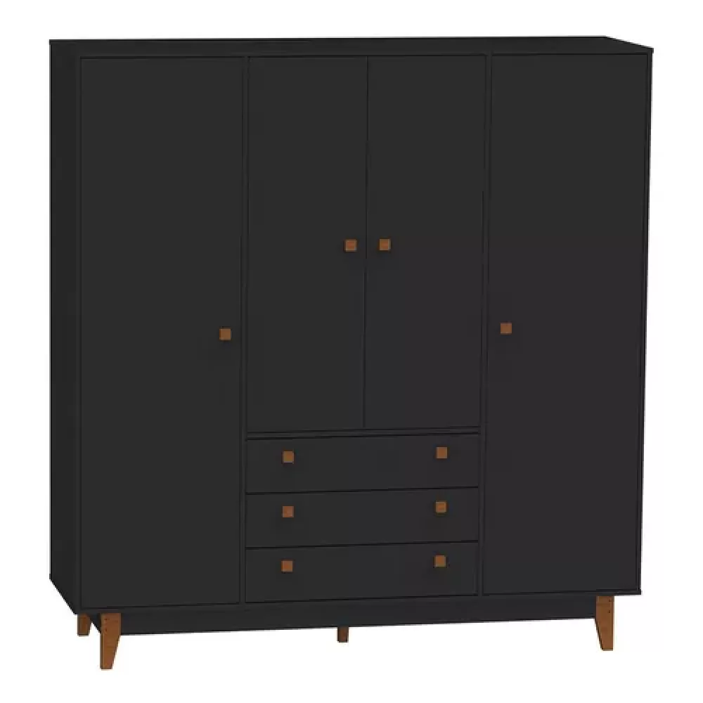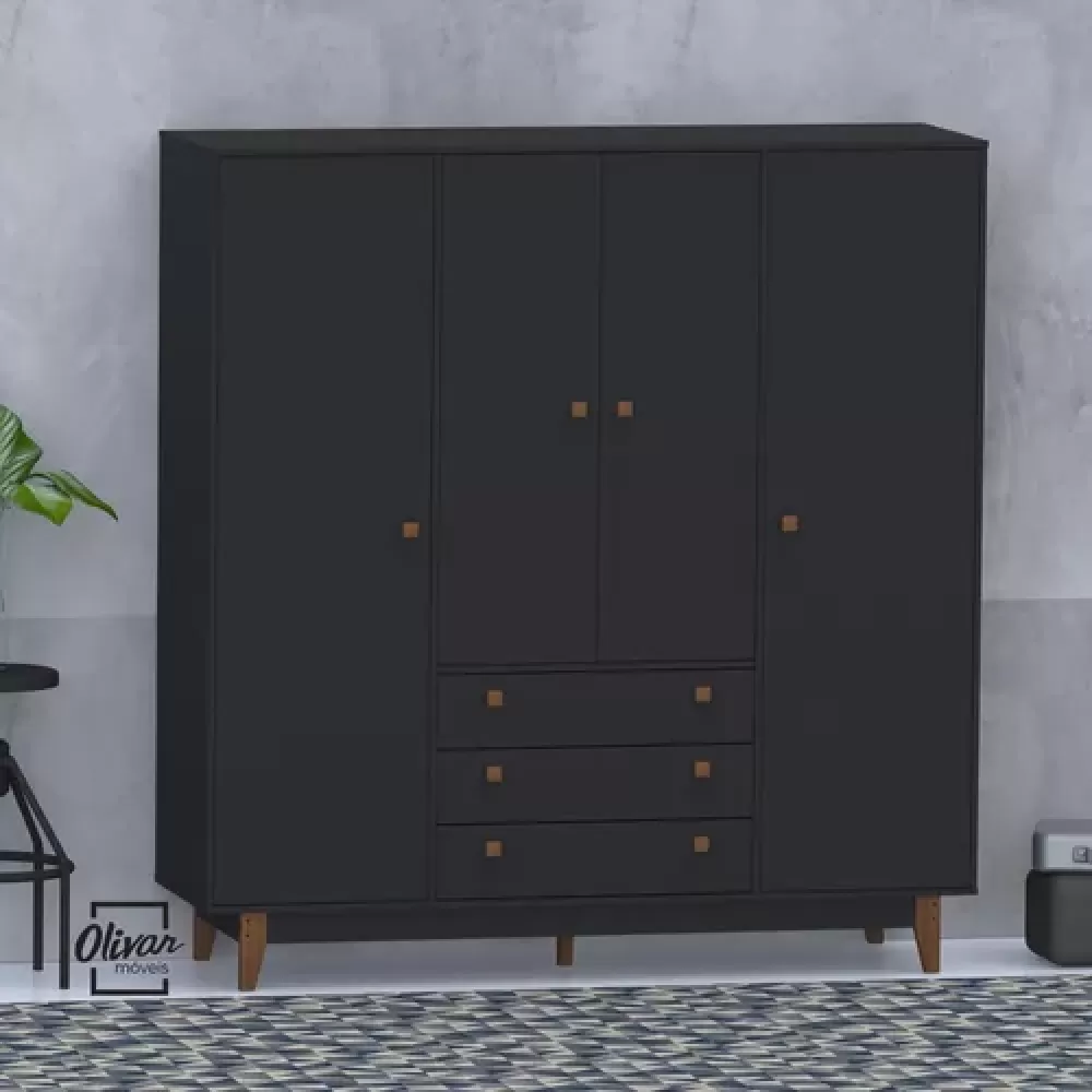 Guarda Roupa Casal Vintage 4 Portas 3 Gavetas Preto - Olivar Móveis