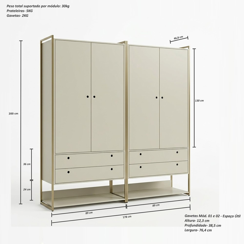 Guarda Roupa Closet Modulado 4 Gavetas 2 Cabideiros Estrutura Metalica 180cm Olivar Off White