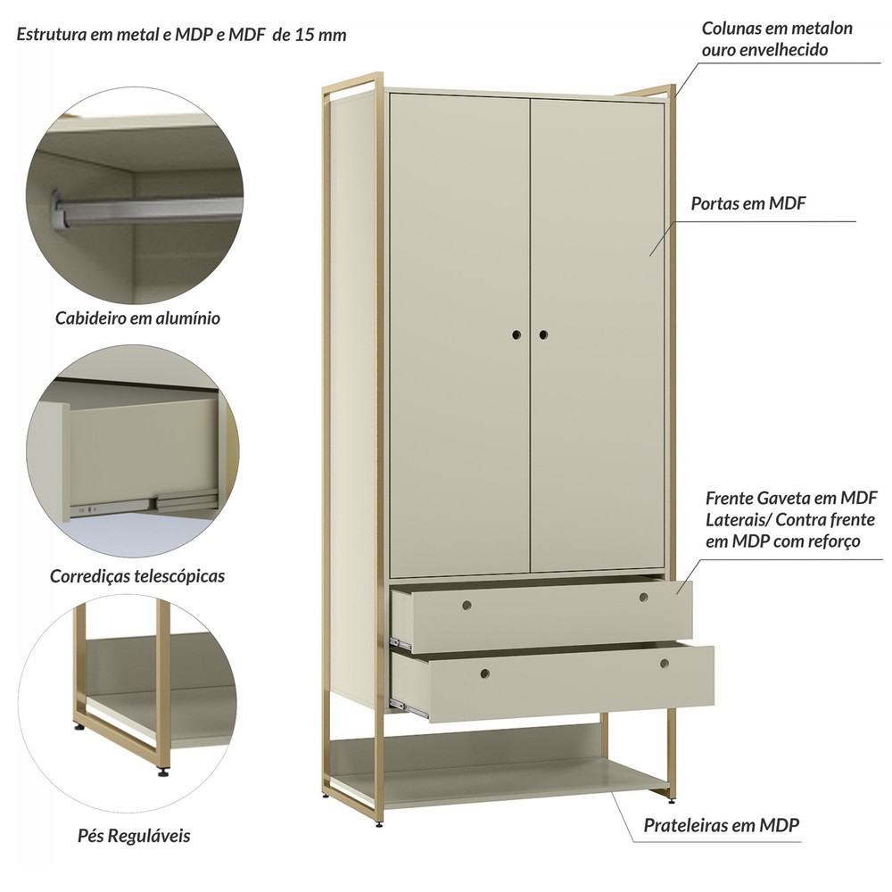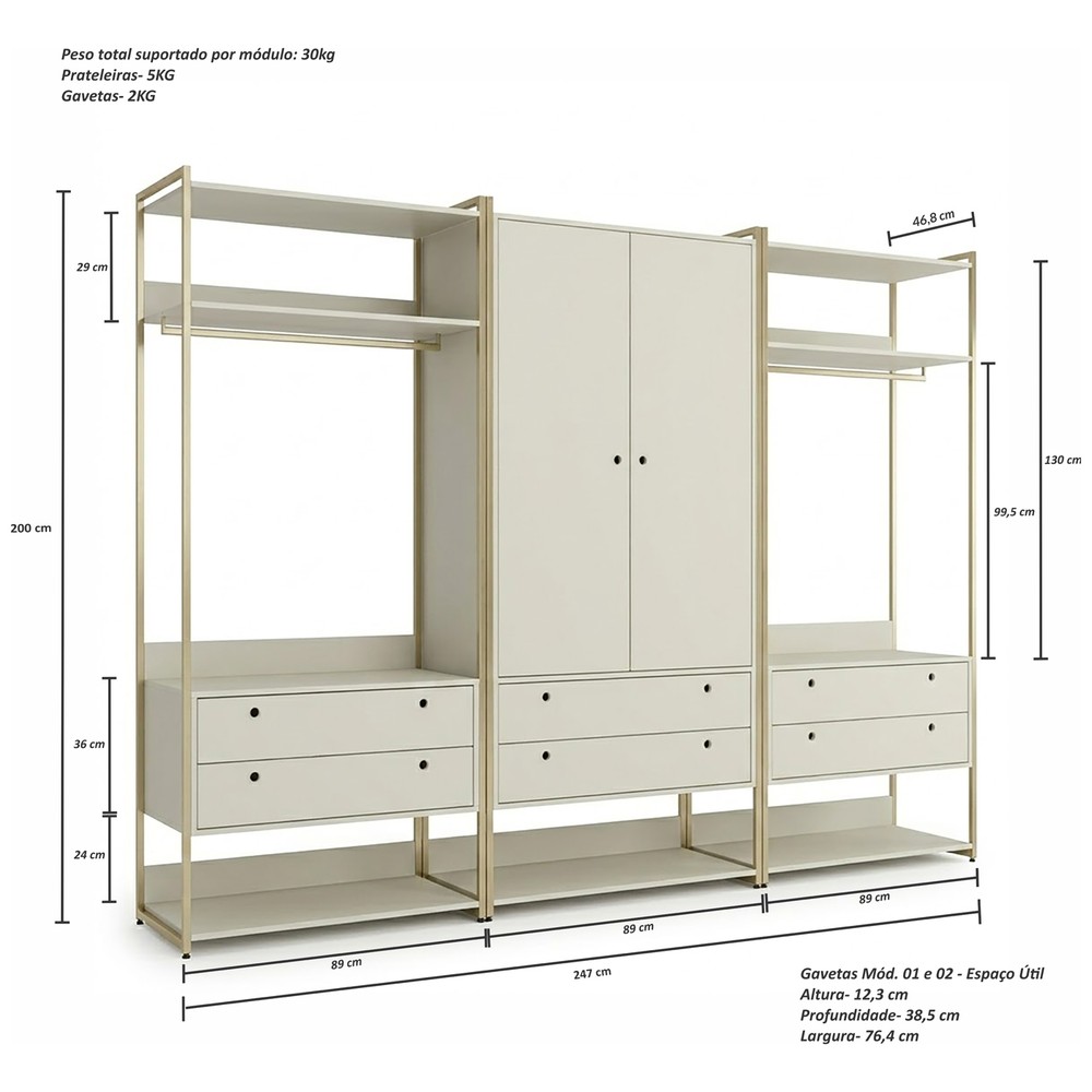 Este é o Conjunto de Closet Ind. Olivar-Módulos 02,05 e 02, produto que mostra uma diversidade de materiais, com metal nas laterais, Portas e Gavetas em MDF de 15mm e demais peças em MDP de 15 mm. Ele possui prateleiras para acomodar objetos ou roupas, 3 cabideiros 2 de metal e 1 cabideiro de alumínio, gavetas com corrediças telescópicas e portas com dobradiças metálicas, tudo com design de uma pegada industrial para quem gosta do estilo mais urbano e contemporâneo onde você personaliza seu ambiente deixando-o exclusivo.