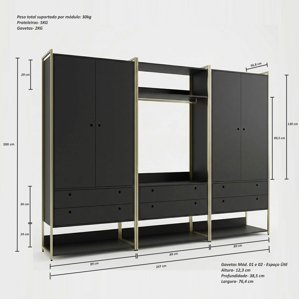 Este é o Conjunto de Closet Ind. Olivar-Módulos 05,02 e 05, produto que mostra uma diversidade de materiais, com metal nas laterais, Portas e Gavetas em MDF de 15mm e demais peças em MDP de 15 mm. Ele possui prateleiras para acomodar objetos ou roupas, 3 cabideiros 1 de metal e 2 cabideiro de alumínio, gavetas com corrediças telescópicas e portas com dobradiças metálicas, tudo com design de uma pegada industrial para quem gosta do estilo mais urbano e contemporâneo onde você personaliza seu ambiente deixando-o exclusivo.
