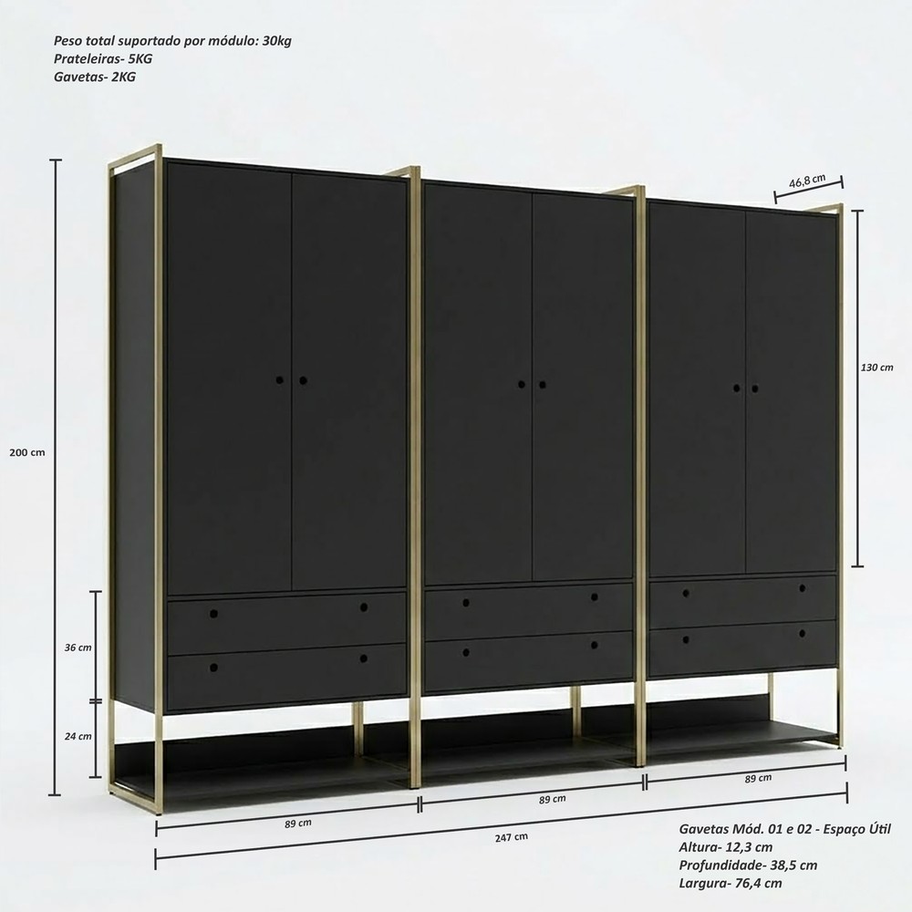 Guarda Roupa Closet Modulado Casal 6 Gavetas 3 Cabideiros Estrutura Metalica 250cm Olivar Preto