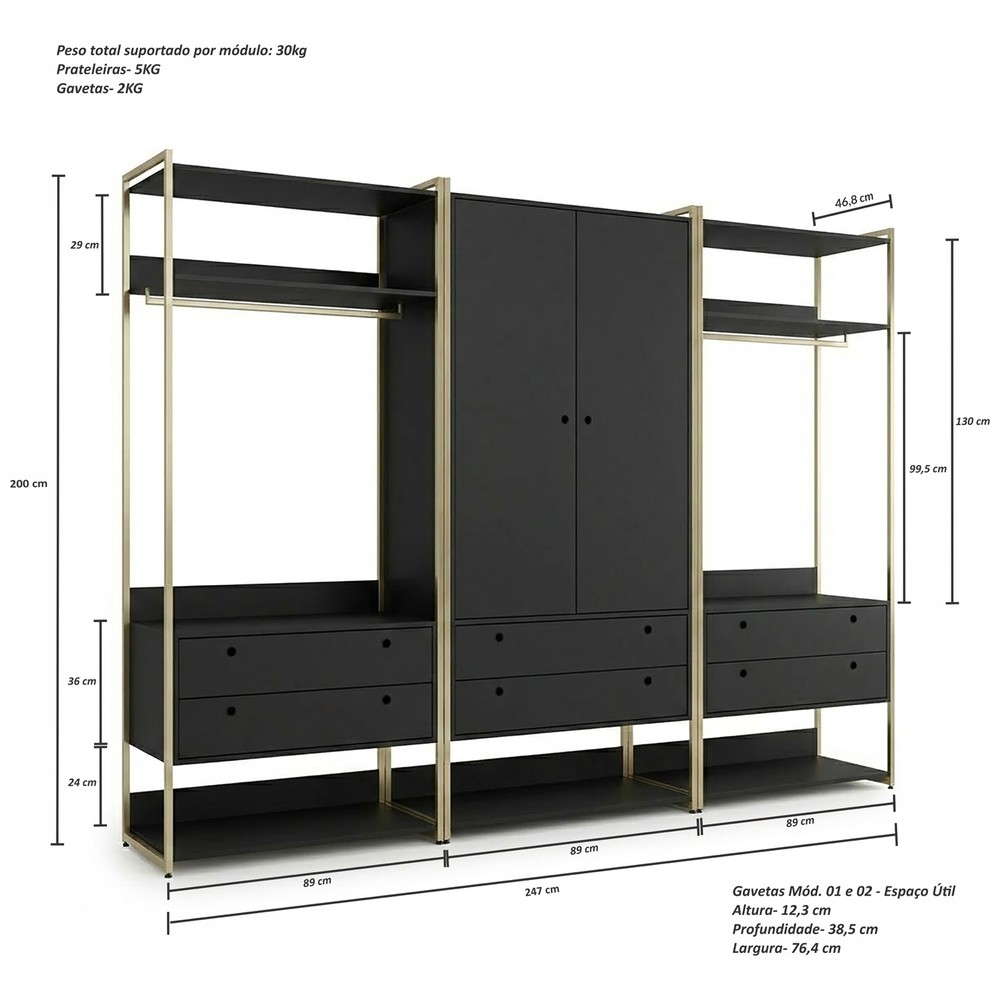 Este é o Conjunto de Closet Ind. Olivar-Módulos 02,05 e 02, produto que mostra uma diversidade de materiais, com metal nas laterais, Portas e Gavetas em MDF de 15mm e demais peças em MDP de 15 mm. Ele possui prateleiras para acomodar objetos ou roupas, 3 cabideiros 2 de metal e 1 cabideiro de alumínio, gavetas com corrediças telescópicas e portas com dobradiças metálicas, tudo com design de uma pegada industrial para quem gosta do estilo mais urbano e contemporâneo onde você personaliza seu ambiente deixando-o exclusivo.