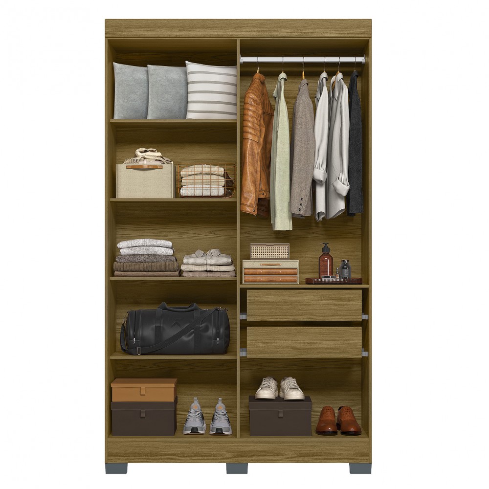 O Guarda Roupa Dakota 4P é um produto útil, com design inovador, destacando duas portas em MDF com frisos e duas sem frisos, os puxadores são mais longos em MDF na cor bronze. Ele possui 7 prateleiras para acomodar objetos, roupas e sapatos, duas gavetas com corrediças telescópicas, um cabideiro em alumínio para você pendurar suas roupas. Possui pés em plástico para que você possa limpar por baixo e também não ter perigo de umidade. Este Guarda Roupa tem um tamanho ideal para o seu dormitório, deixando-o organizado e personalizados.