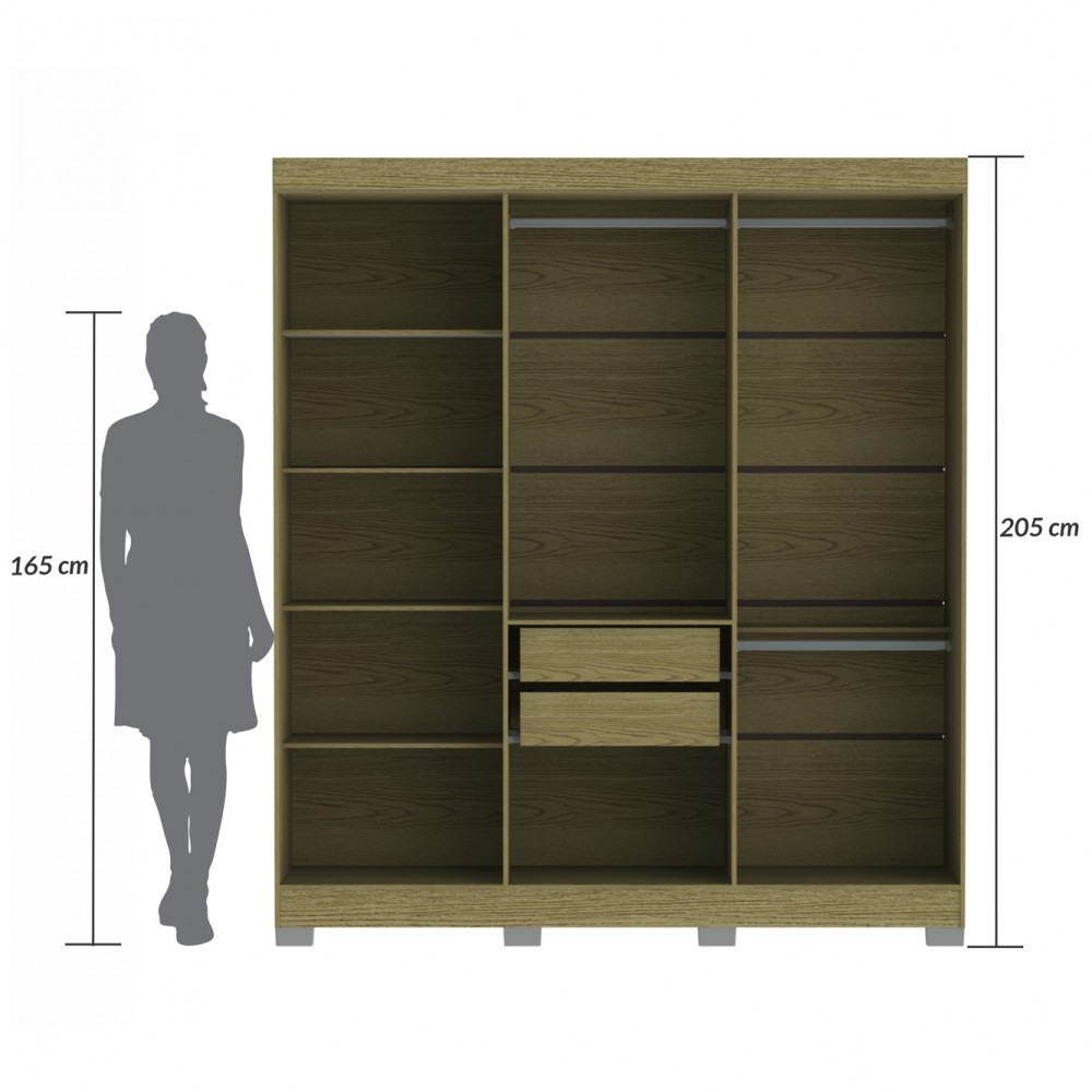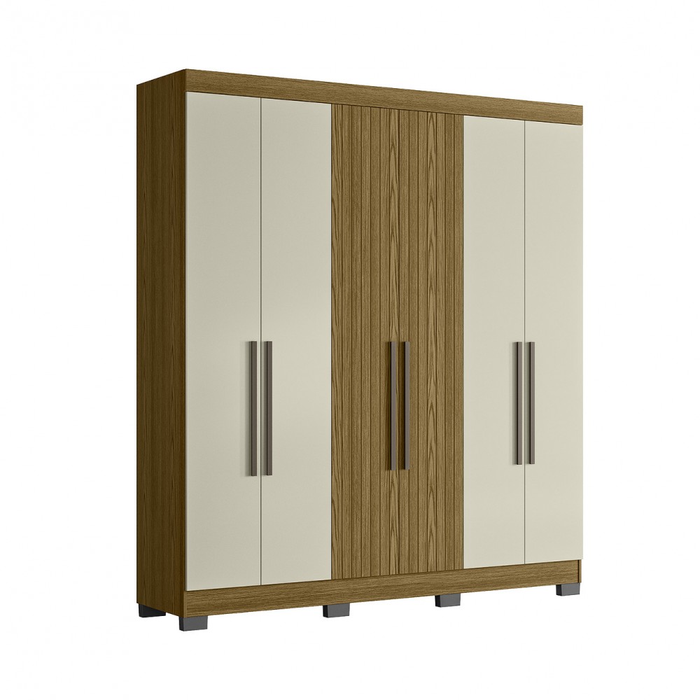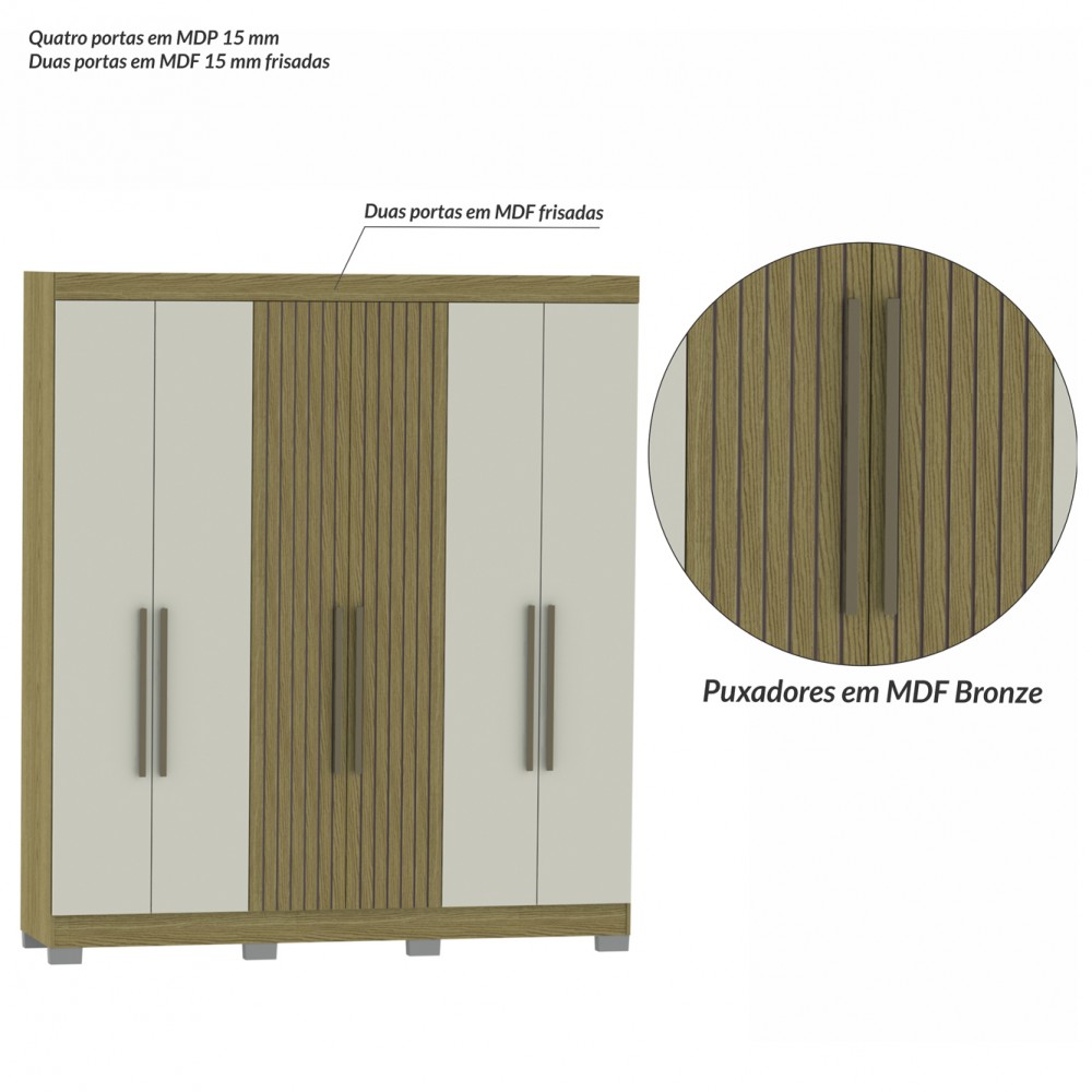 O Guarda Roupa Dakota 6P é um produto útil, com design inovador, destacando duas portas em MDF com frisos e quatro sem frisos, os puxadores são mais longos com 50 cm em MDF na cor bronze. Ele possui 9 prateleiras para acomodar objetos, roupas e sapatos, duas gavetas com corrediças telescópicas, três cabideiros em alumínio para você pendurar todas suas roupas e um deles serve como calceiro. Possui pés em plástico para que você possa limpar por baixo e também não ter perigo de umidade. Este Guarda Roupa tem um tamanho ideal para o seu dormitório, deixando-o organizado e personalizado.