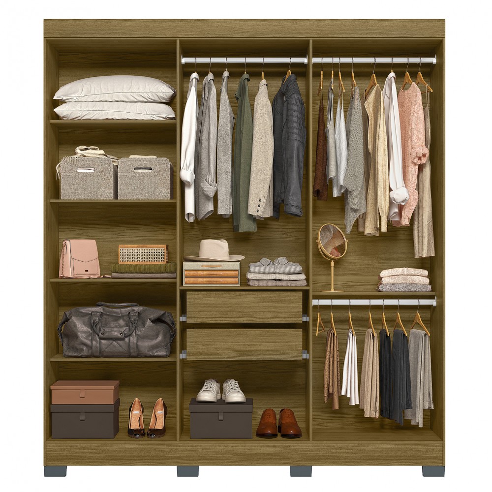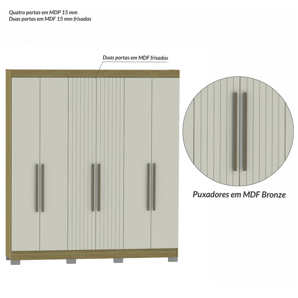 O Guarda Roupa Dakota 6P é um produto útil, com design inovador, destacando duas portas em MDF com frisos e quatro sem frisos, os puxadores são mais longos com 50 cm em MDF na cor bronze. Ele possui 9 prateleiras para acomodar objetos, roupas e sapatos, duas gavetas com corrediças telescópicas, três cabideiros em alumínio para você pendurar todas suas roupas e um deles serve como calceiro. Possui pés em plástico para que você possa limpar por baixo e também não ter perigo de umidade. Este Guarda Roupa tem um tamanho ideal para o seu dormitório, deixando-o organizado e personalizado.