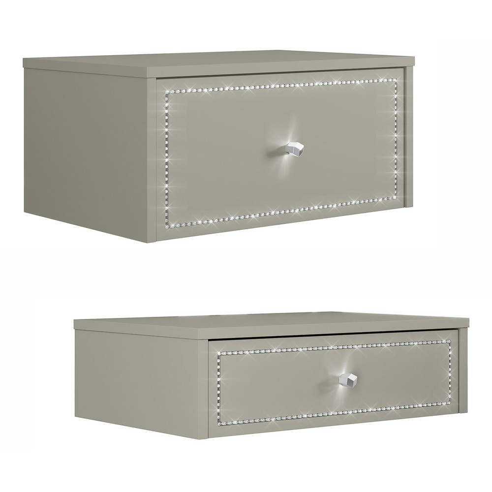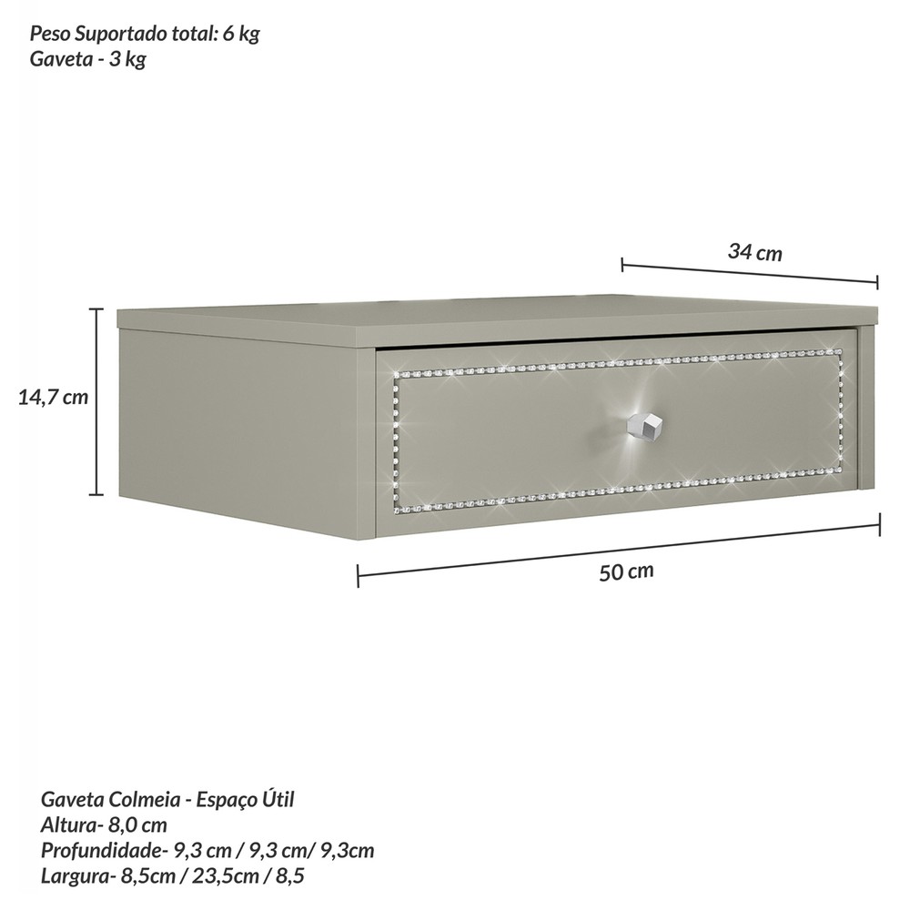 A Penteadeira Suspensa Strass e a Mesa de Cabeceira Suspensa Strass são produtos com um design moderno, inspirado no estilo italiano com um toque romântico e sofisticado. Possui um detalhe na gaveta com um friso preenchido com uma corrente de pedras em strass dando um brilho intenso, o puxador é na forma hexagonal refletindo o seu brilho na peça. Ela é suspensa na parede e bem compacta onde você poderá colocar ao lado da cama como uma mesa de cabeceira, economizando espaço e ampliando seu ambiente. Possui uma gaveta com corrediças telescópicas e nela contém uma colmeia para você rechear com maquiagens, acessórios e produtos para beleza. Este produto mostra ao mesmo tempo sofisticação, delicadeza e uma elegância luxuosa para o seu ambiente.