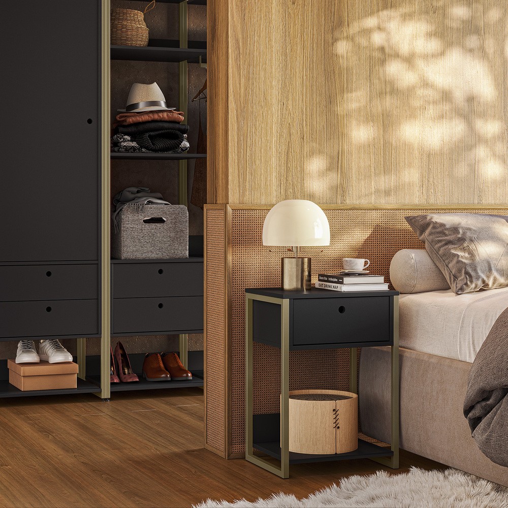 A Mesa Cabeceira Ind. Olivar é um produto com um design inovador, com as laterais em metal na cor ouro envelhecido e MDP e MDF de 15 mm. Possui 1 prateleira para objetos, uma gaveta com corrediças telescópicas. É um produto com design de uma pegada industrial para quem gosta do estilo mais urbano e contemporâneo onde você personaliza seu ambiente deixando-o exclusivo. Este produto você poderá combinar com os Closets da Olivar nas cores Preto ou Off White.