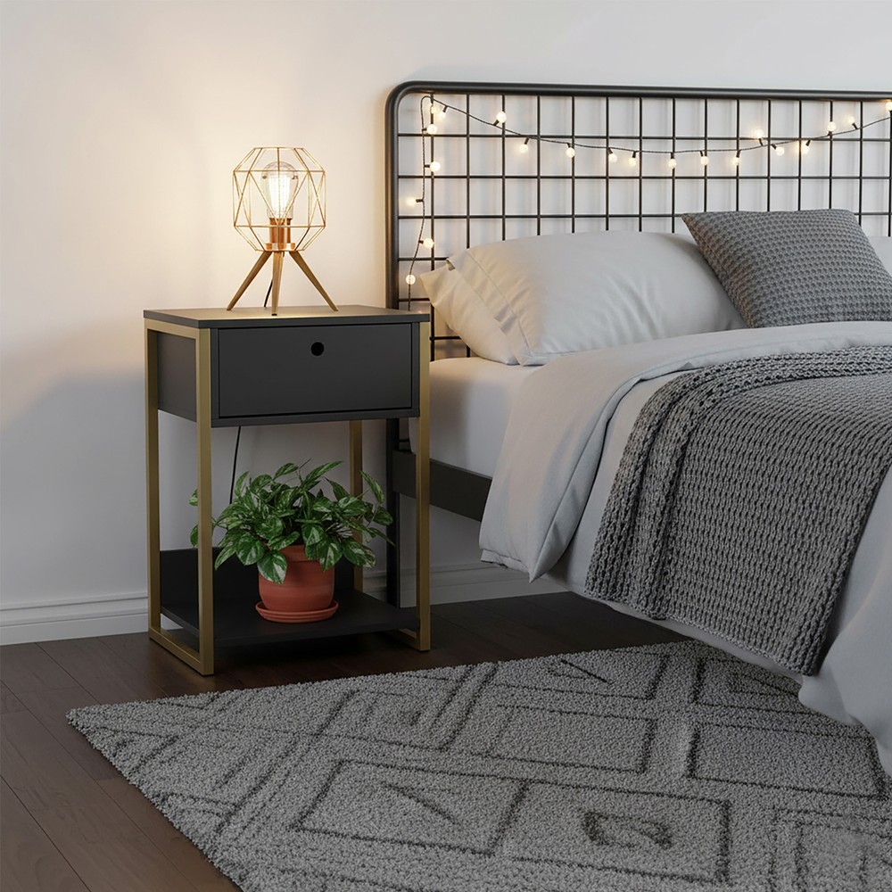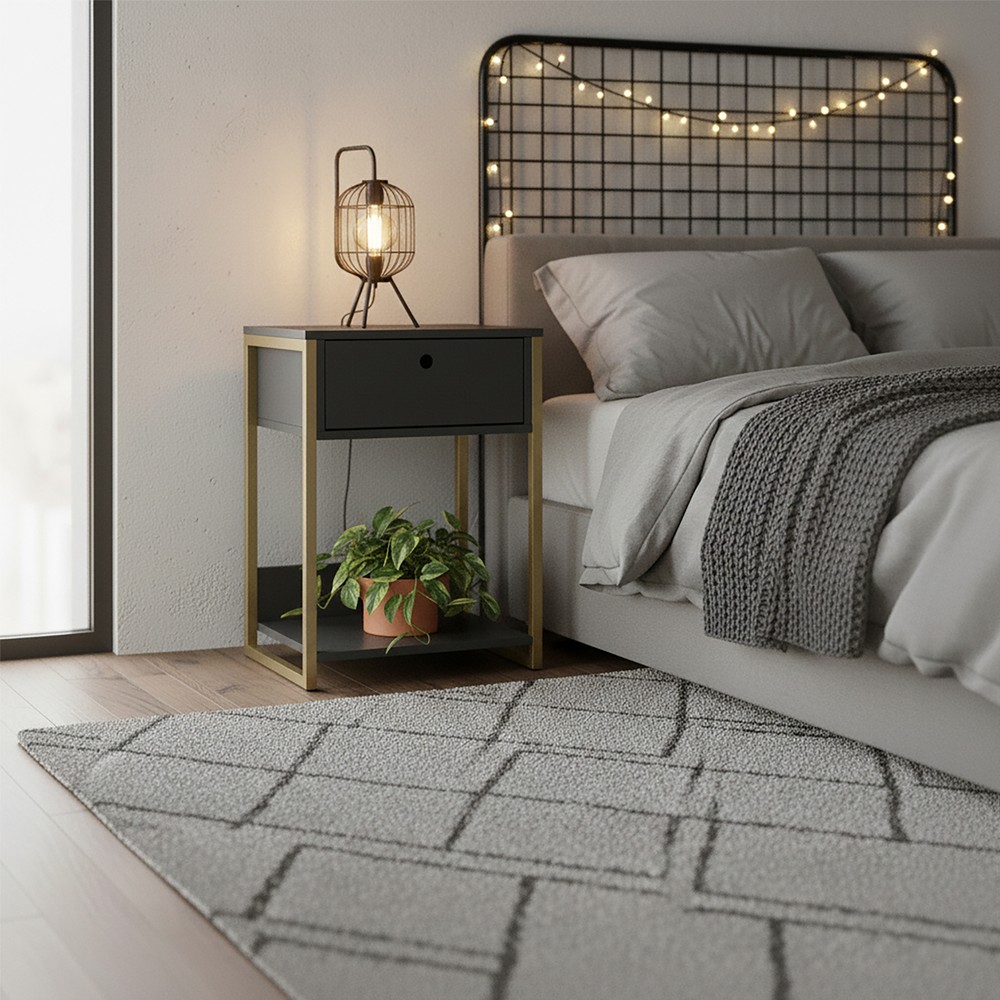 A Mesa Cabeceira Ind. Olivar é um produto com um design inovador, com as laterais em metal na cor ouro envelhecido e MDP e MDF de 15 mm. Possui 1 prateleira para objetos, uma gaveta com corrediças telescópicas. É um produto com design de uma pegada industrial para quem gosta do estilo mais urbano e contemporâneo onde você personaliza seu ambiente deixando-o exclusivo. Este produto você poderá combinar com os Closets da Olivar nas cores Preto ou Off White.