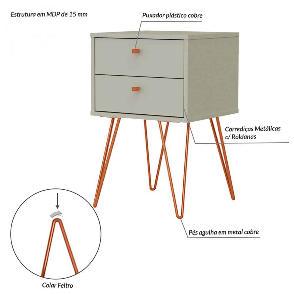 O Criado Retrô Metal Bled é um móvel com uma pegada retrô, combina em qualquer ambiente para sua decoração, salas, quarto, etc. Tem como diferencial seus pés de metal em formato agulha de 35 cm. Possui duas gavetas com corrediças deslizantes e metálicas e dois puxadores.