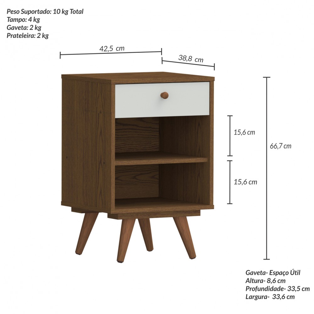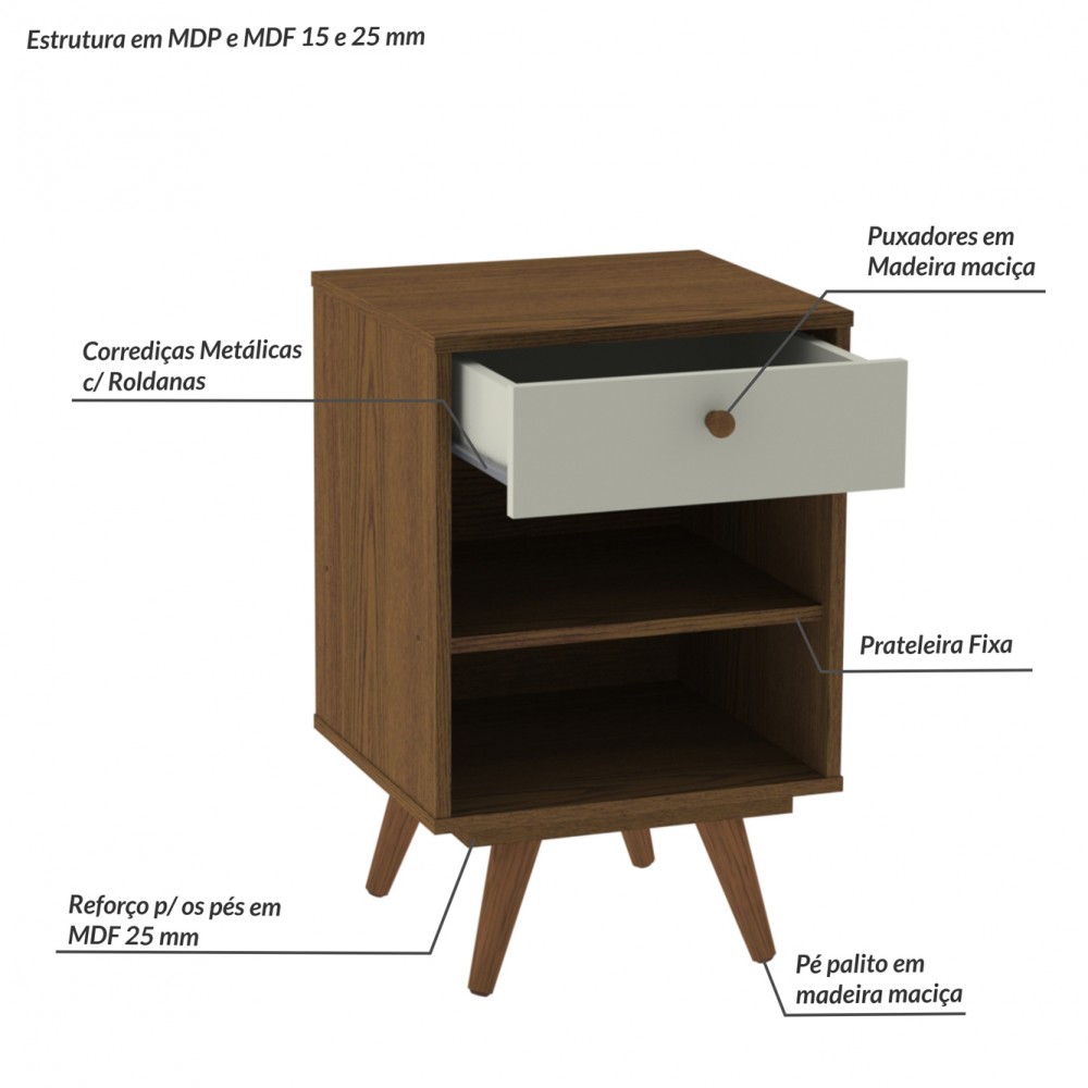 Criado Retro Plus, possui , gaveta com corrediças metálicas, prateleira interna para acomodação de diversos objetos. Possui pés palito em madeira trazendo o design retrô.