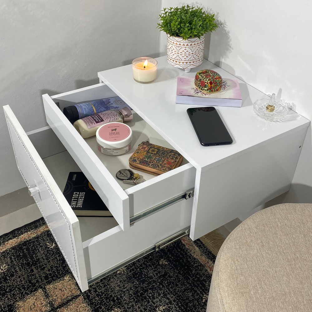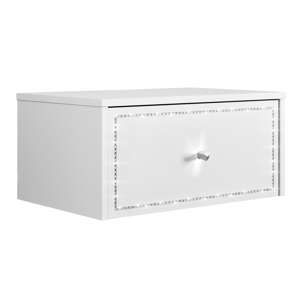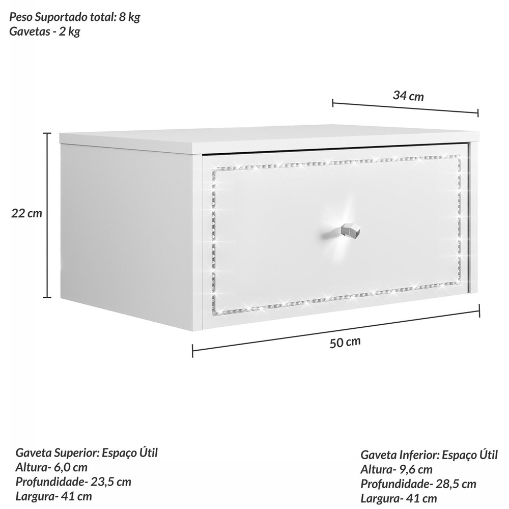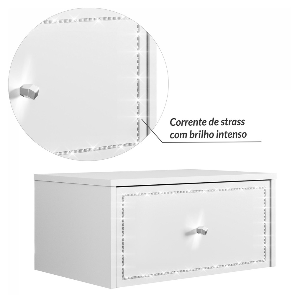 Esta Mesa de Cabeceira Suspensa Strass é um produto com um design moderno, inspirado no estilo italiano com um toque romântico e sofisticado. Possui um detalhe na gaveta com um friso preenchido com uma corrente de pedras em strass dando um brilho intenso, o puxador é na forma hexagonal refletindo o seu brilho na peça. Ele é suspenso na parede, economizando espaço e ampliando seu ambiente. Possui duas gavetas com corrediças telescópicas e uma delas é embutida onde poderá colocar objetos menores. Este produto mostra ao mesmo tempo sofisticação, delicadeza e uma elegância luxuosa para o seu ambiente.