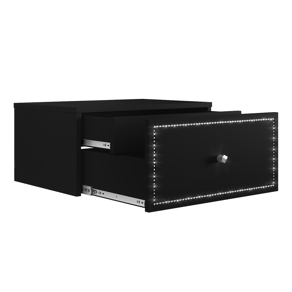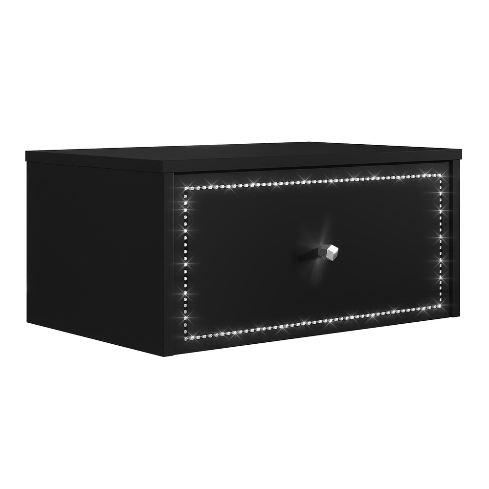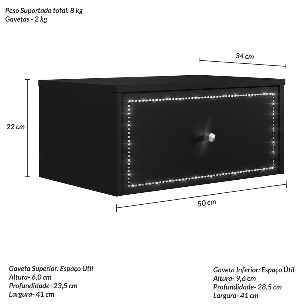 Esta Mesa de Cabeceira Suspensa Strass é um produto com um design moderno, inspirado no estilo italiano com um toque romântico e sofisticado. Possui um detalhe na gaveta com um friso preenchido com uma corrente de pedras em strass dando um brilho intenso, o puxador é na forma hexagonal refletindo o seu brilho na peça. Ele é suspenso na parede, economizando espaço e ampliando seu ambiente. Possui duas gavetas com corrediças telescópicas e uma delas é embutida onde poderá colocar objetos menores. Este produto mostra ao mesmo tempo sofisticação, delicadeza e uma elegância luxuosa para o seu ambiente.
