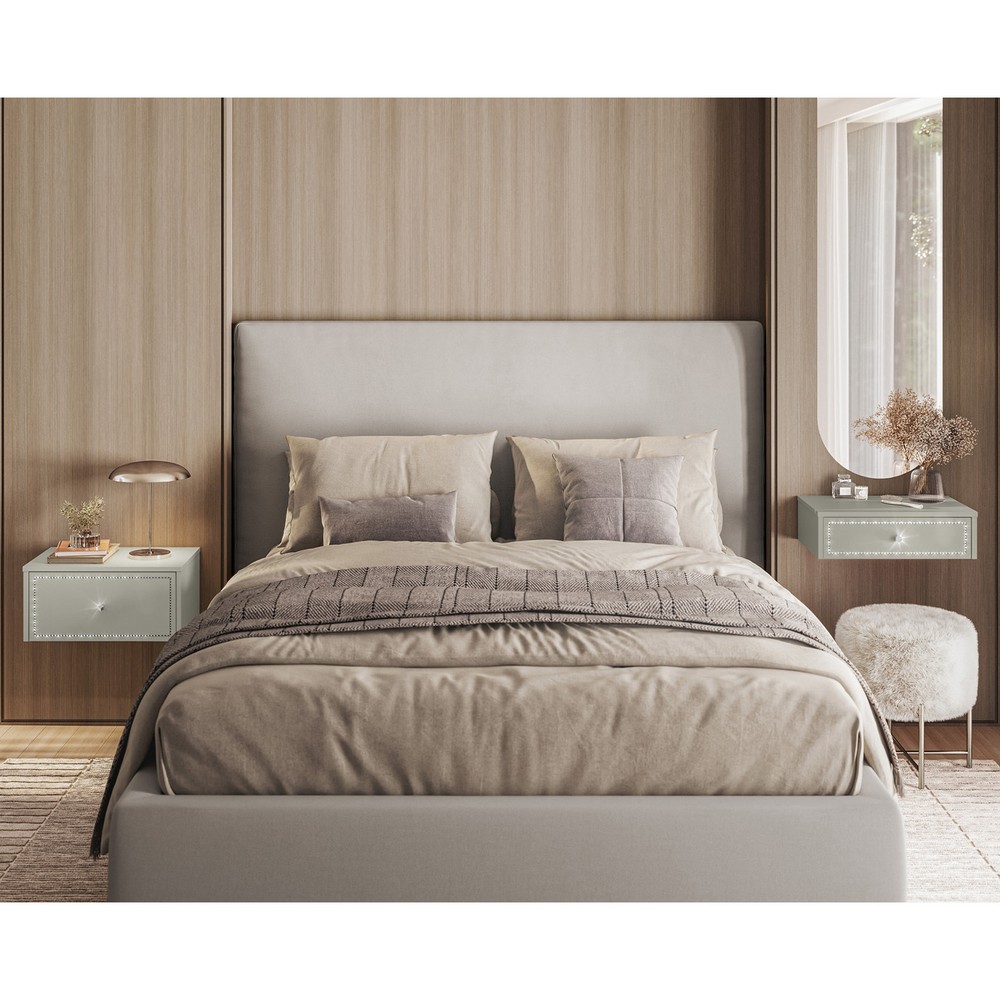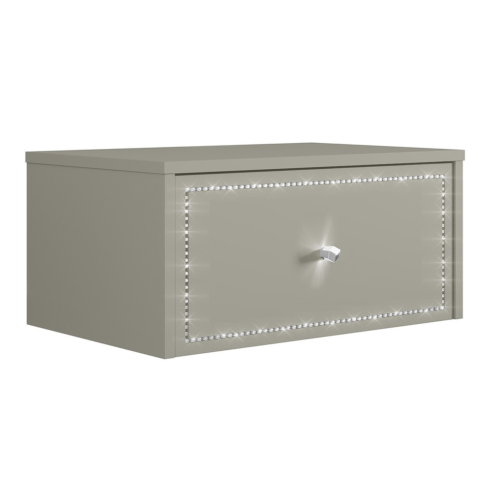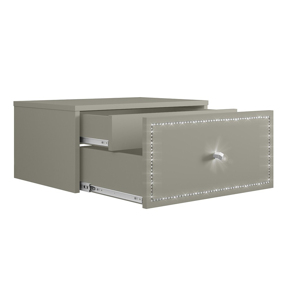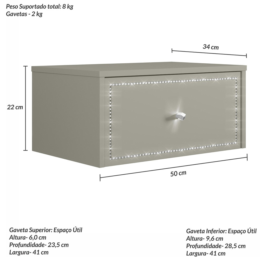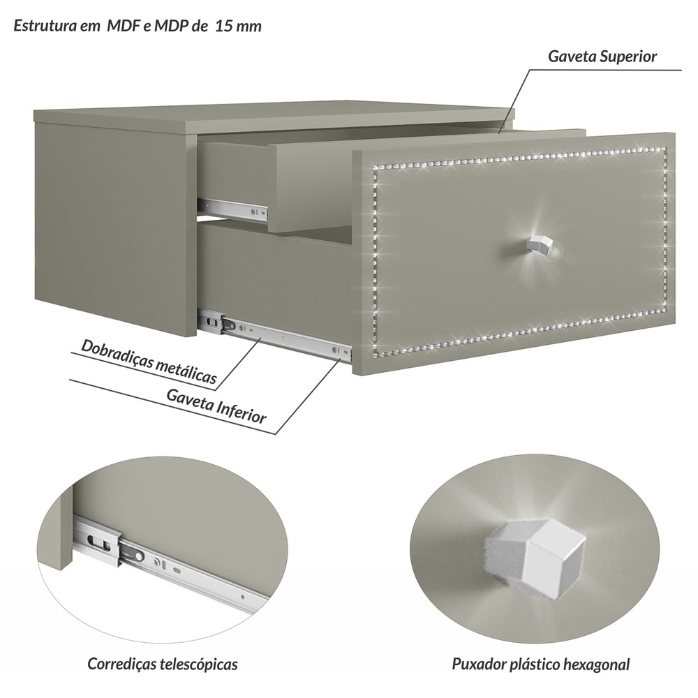 Esta Mesa de Cabeceira Suspensa Strass é um produto com um design moderno, inspirado no estilo italiano com um toque romântico e sofisticado. Possui um detalhe na gaveta com um friso preenchido com uma corrente de pedras em strass dando um brilho intenso, o puxador é na forma hexagonal refletindo o seu brilho na peça. Ele é suspenso na parede, economizando espaço e ampliando seu ambiente. Possui duas gavetas com corrediças telescópicas e uma delas é embutida onde poderá colocar objetos menores. Este produto mostra ao mesmo tempo sofisticação, delicadeza e uma elegância luxuosa para o seu ambiente.