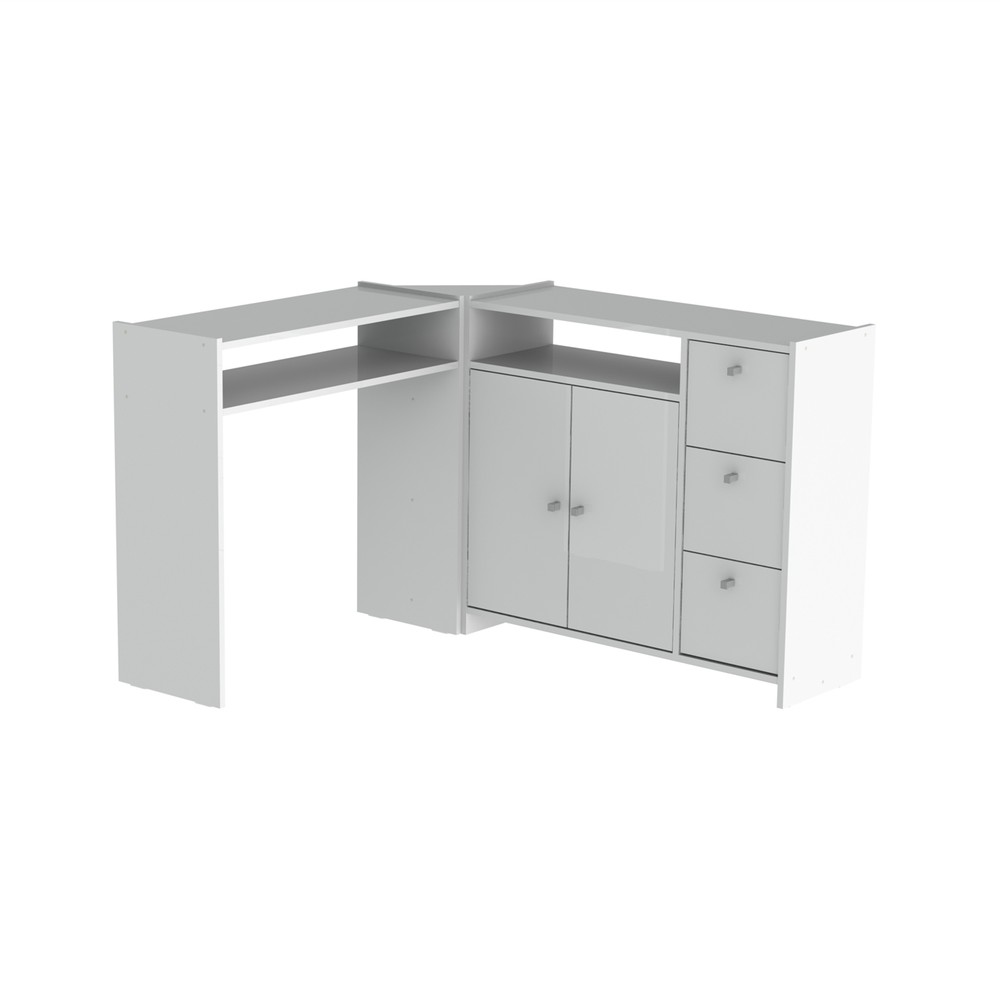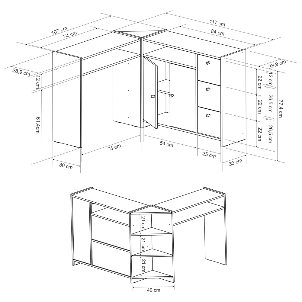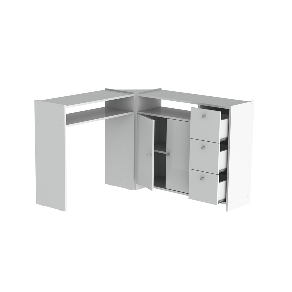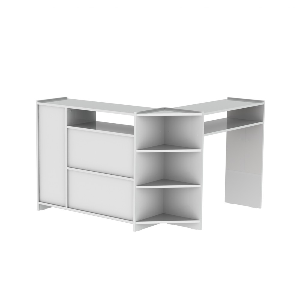 Esta mesa é ideal e prática para o seu trabalho. Ela é de canto, possui duas prateleiras, dois tampos para distribuir acessórios de manicure, um compartimento fechado com duas portas e uma prateleira interna e também três gavetas com corrediças telescópicas e puxadores. No meio ela ainda possui quatro prateleiras de canto onde você poderá acomodar vários objetos facilitando o trabalho e também uma linda decoração.