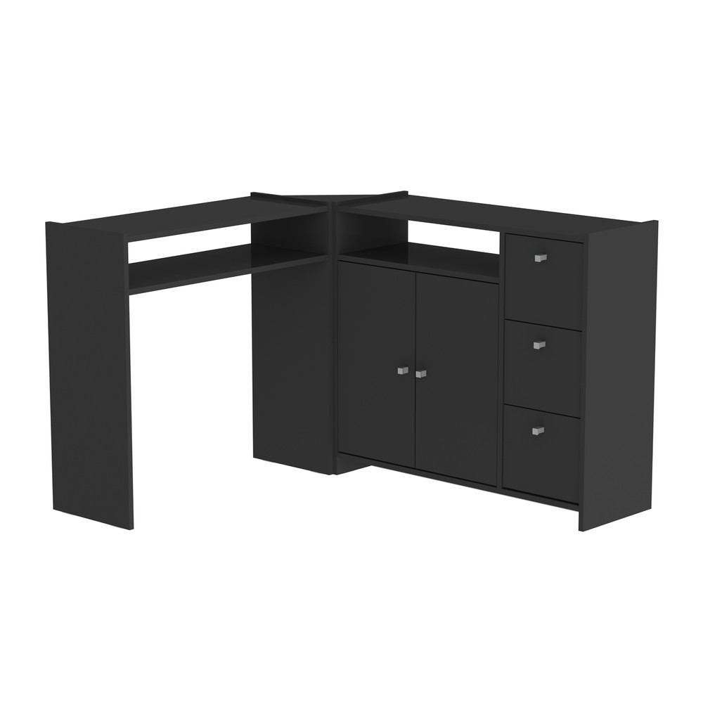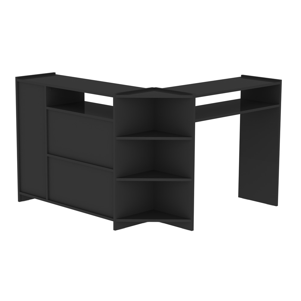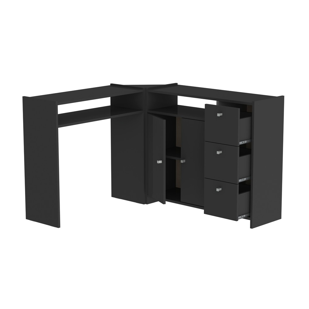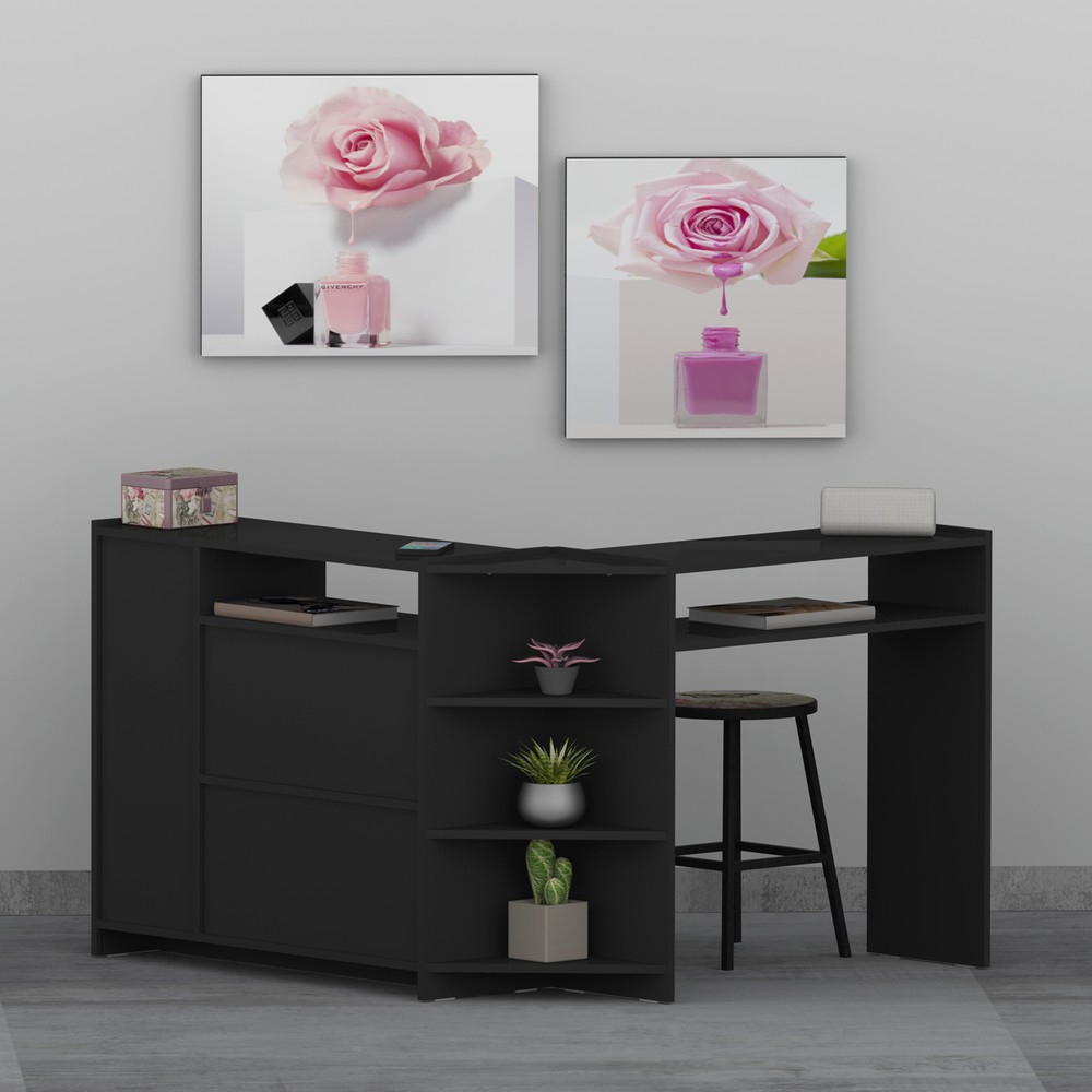 Esta mesa é ideal e prática para o seu trabalho. Ela é de canto, possui duas prateleiras, dois tampos para distribuir acessórios de manicure, um compartimento fechado com duas portas e uma prateleira interna e também três gavetas com corrediças telescópicas e puxadores. No meio ela ainda possui quatro prateleiras de canto onde você poderá acomodar vários objetos facilitando o trabalho e também uma linda decoração.
