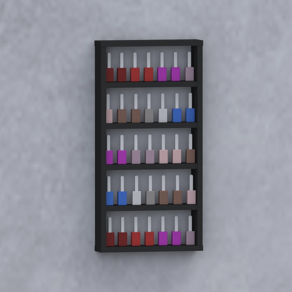 Este expositor é tudo que você precisa para expor os seus esmaltes para suas clientes com um tamanho ideal. Possui cinco prateleiras fixas e será fixado na parede com pino invisível e buchas.