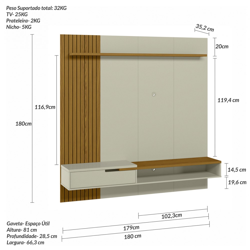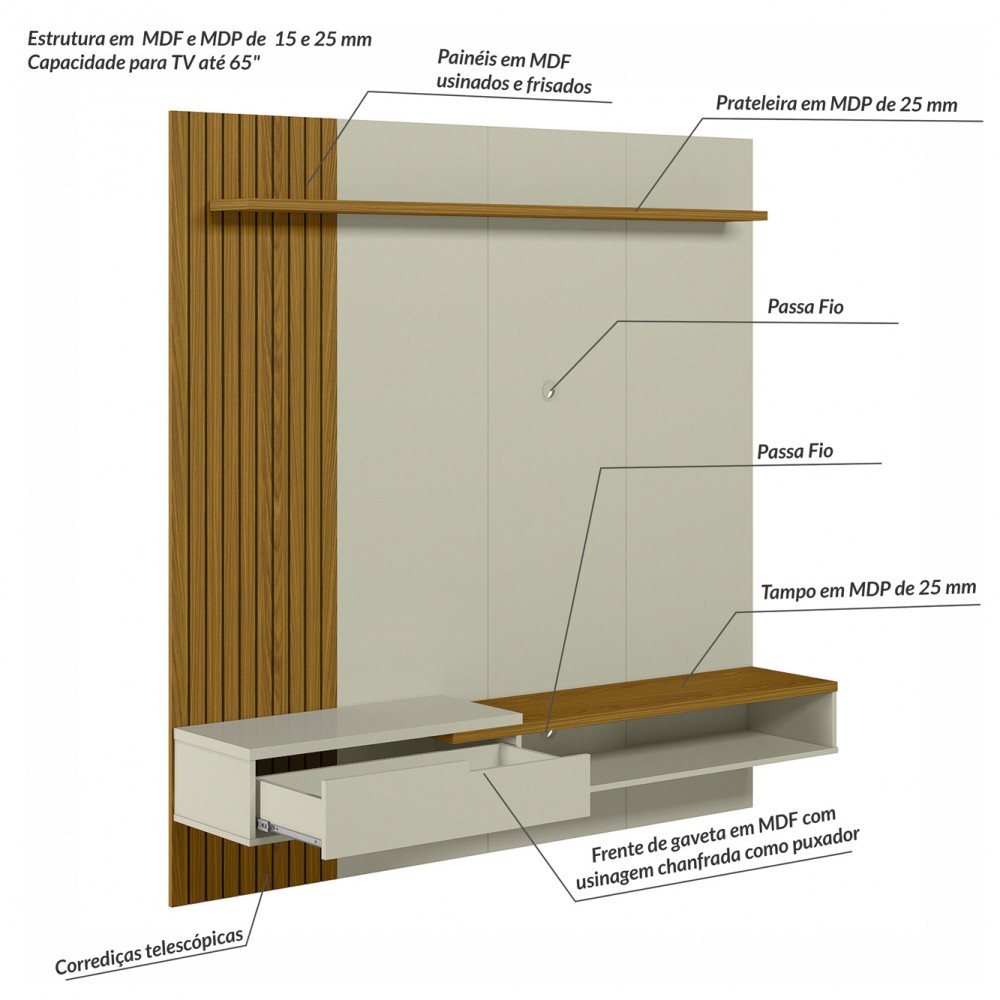 Painel Decor Ripado P/Tvs Até 65 Polegadas C/ Nicho Suspenso 180cm Off White/Cedro - Olivar Móveis