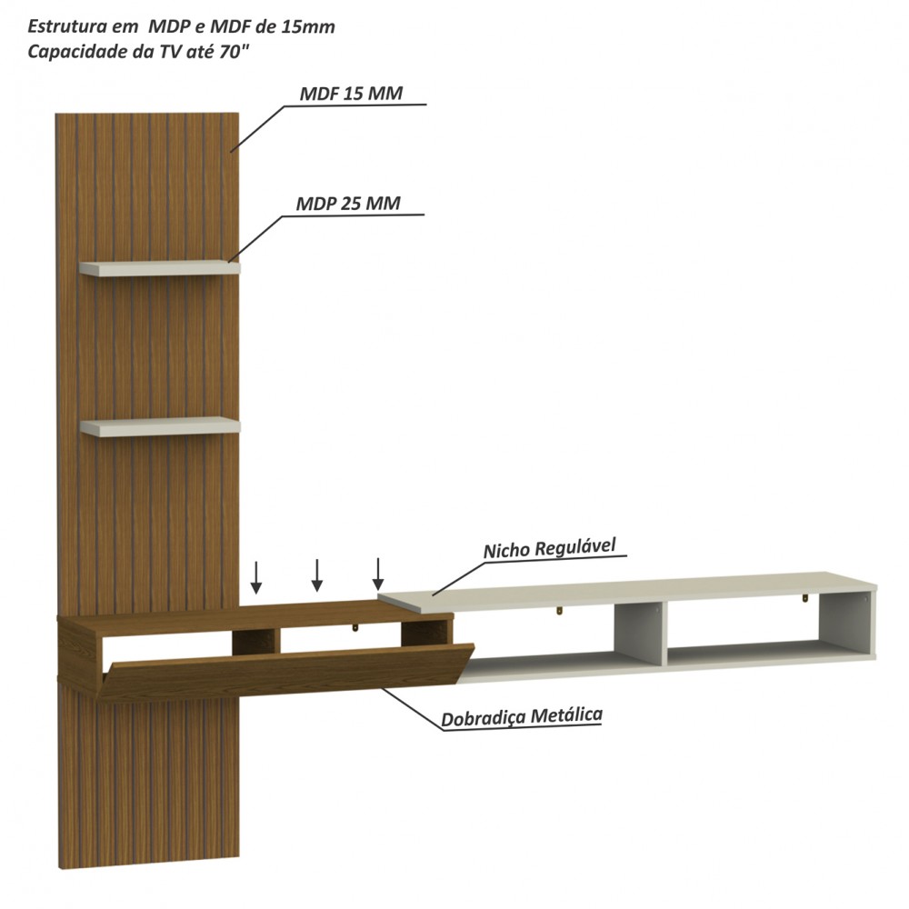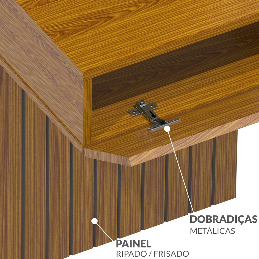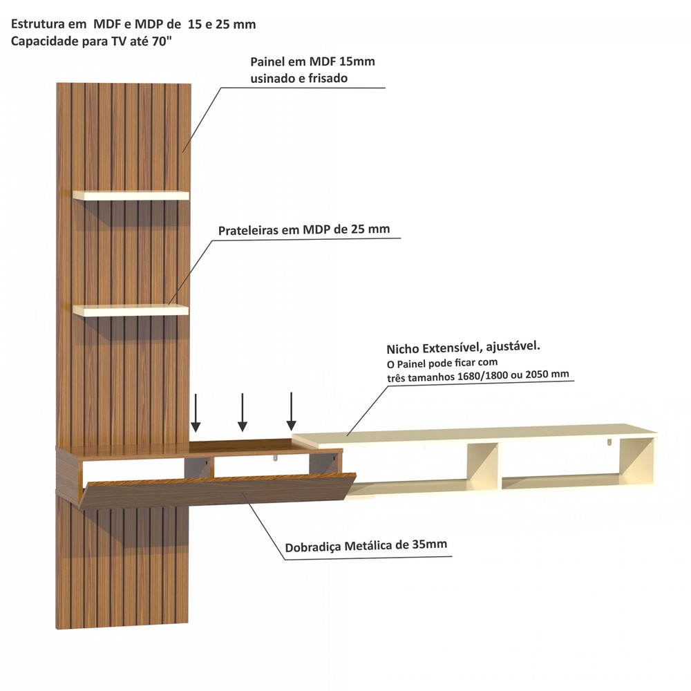 O Painel Ripado Flex é um produto com um design de frisos caracterizando o ripado, facilitando a limpeza e deixando-o mais clean. Sua estrutura é em MDF e MDP de 15 e 25 mm. Possui duas prateleiras de 25mm, um painel superior e um painel inferior em MDF frisado na vertical podendo se instalado do lado esquerdo ou direito. Possui também um compartimento fechado com uma porta basculante e um nicho sobreposto com três posições versáteis, onde o móvel poderá ficar com três comprimentos que você poderá escolher, com 205 cm ou com 180 cm ou 168 cm. É um produto inovador com estilo italiano onde sua TV você poderá instalar na parede, deixando seu ambiente personalizado e exclusivo.