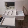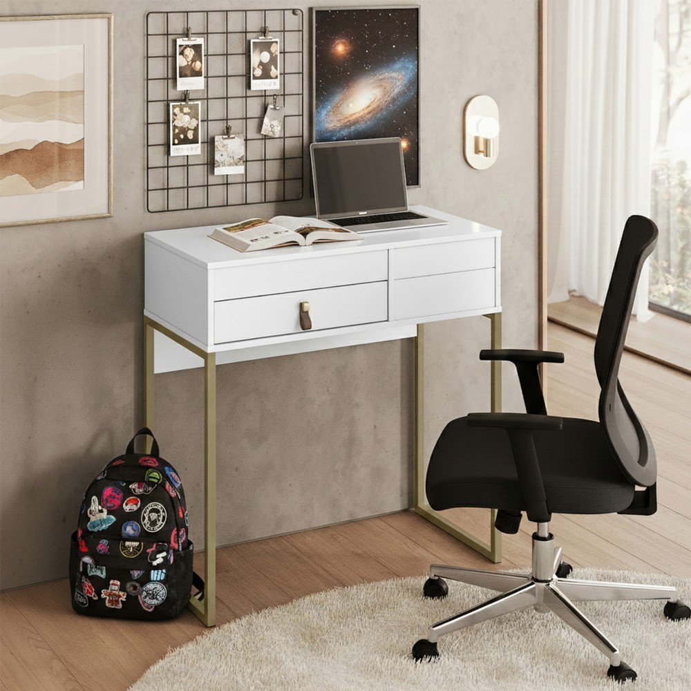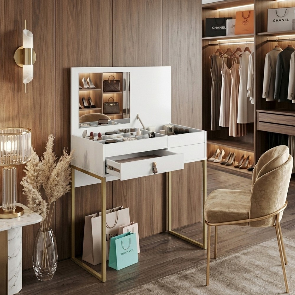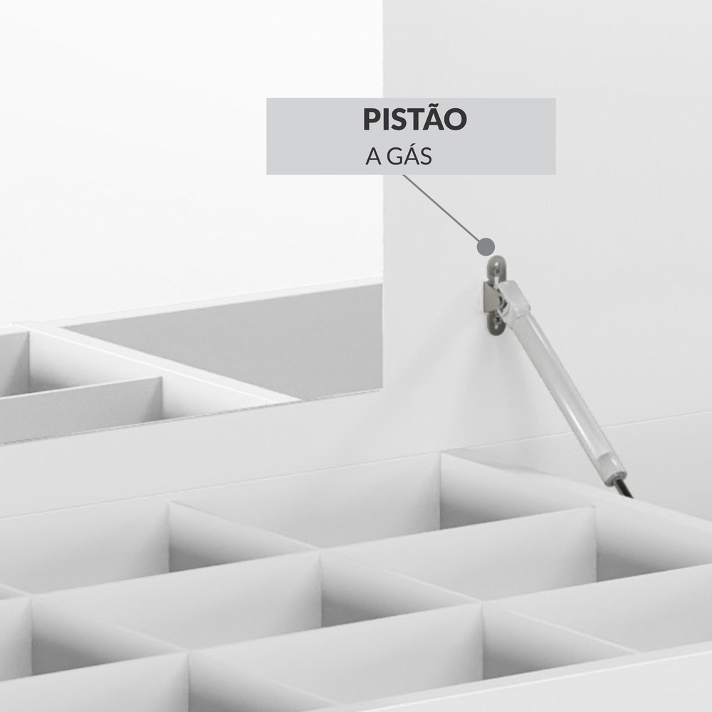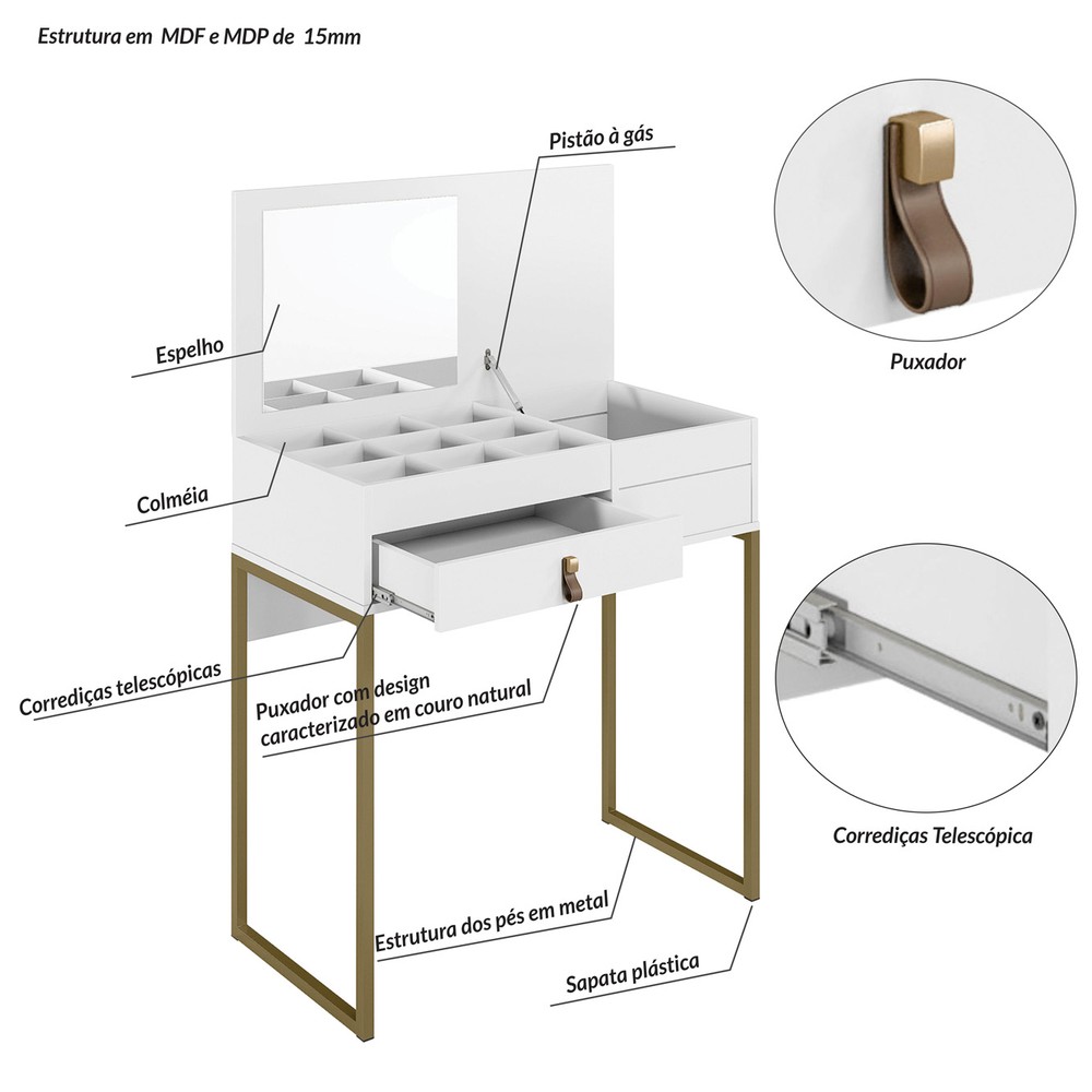 A Penteadeira Industrial é um produto com um design inovador, com as laterais em metal na cor ouro envelhecido, espelho no tampo e pistão a gás, sua estrutura é em MDP e MDF de 15 mm. Possui uma colmeia para você rechear com maquiagens, acessórios e produtos para beleza, uma gaveta com corrediça telescópica e mais um compartimento para colocar produtos mais altos. Seu puxador possui um design com características de couro natural. É um produto com design de uma pegada industrial para quem gosta do estilo mais urbano e contemporâneo, onde você personaliza seu ambiente com exclusividade.