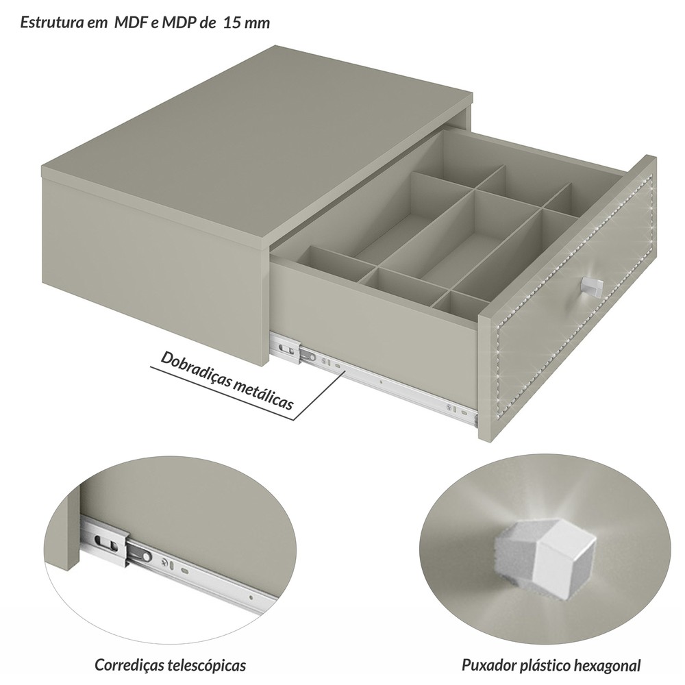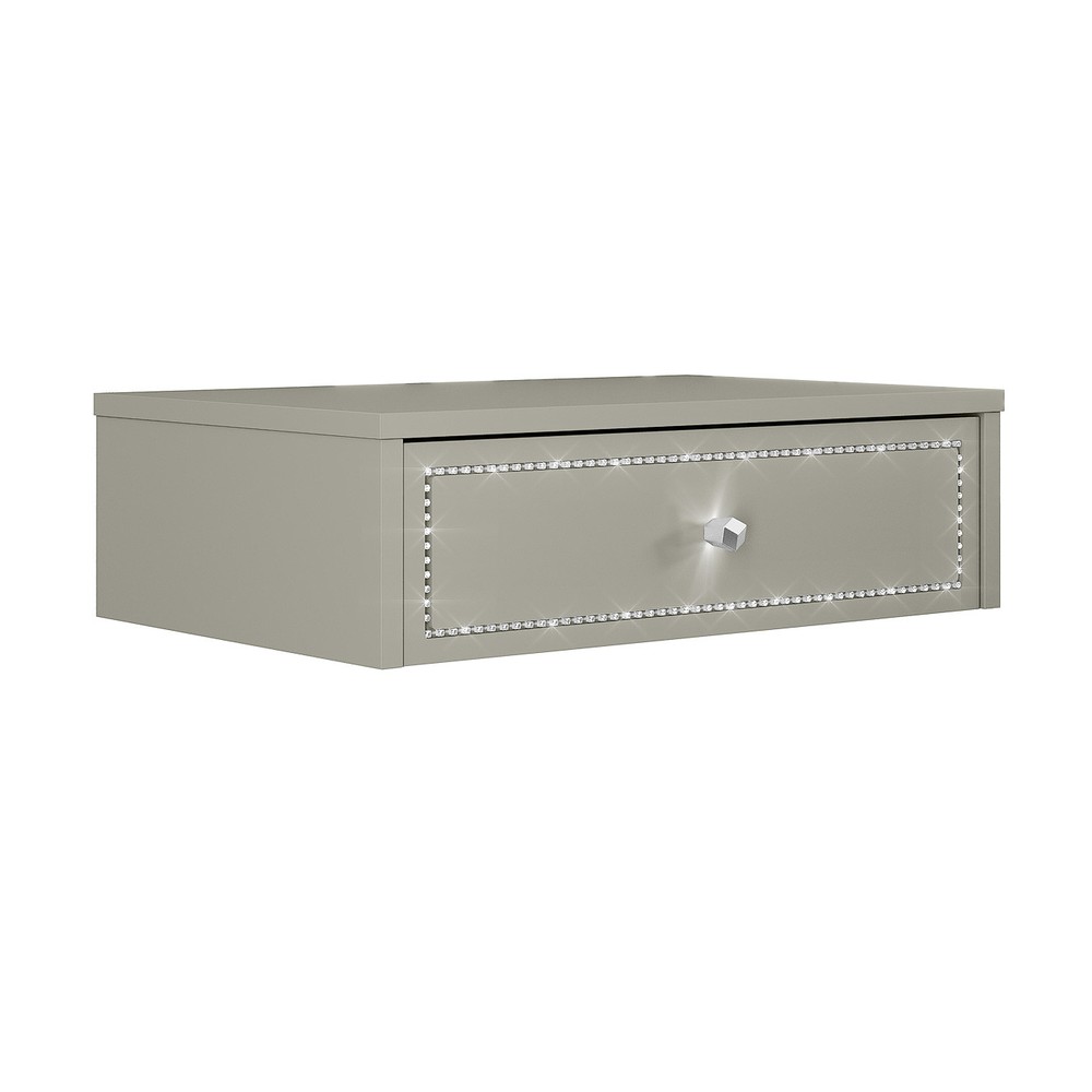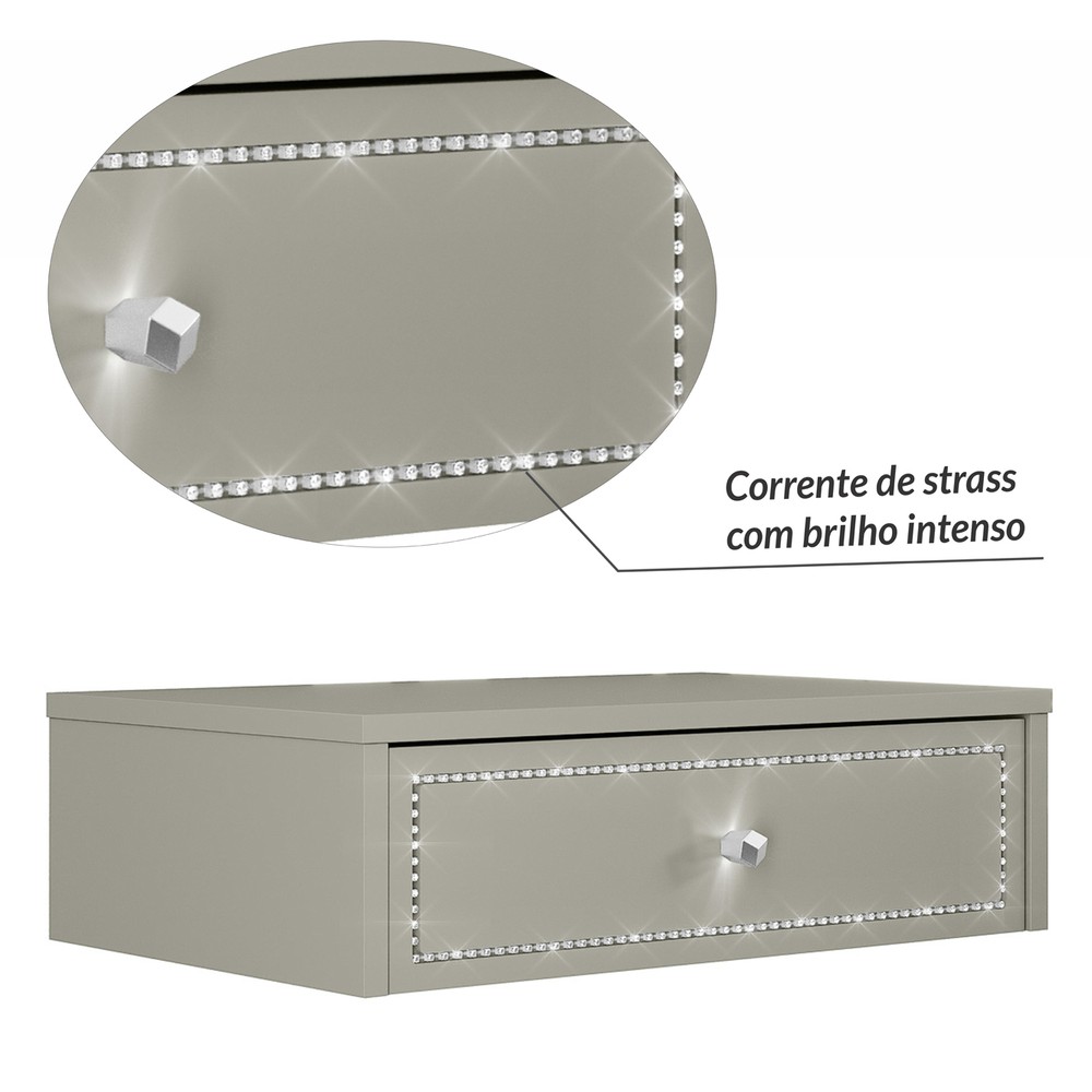 A Penteadeira Suspensa Strass é um produto com um design moderno, inspirado no estilo italiano com um toque romântico e sofisticado. Possui um detalhe na gaveta com um friso preenchido com uma corrente de pedras em strass dando um brilho intenso, o puxador é na forma hexagonal refletindo o seu brilho na peça. Ela é suspensa na parede e bem compacta onde você poderá colocar ao lado da cama como uma mesa de cabeceira, economizando espaço e ampliando seu ambiente. Possui uma gaveta com corrediças telescópicas e nela contém uma colmeia para você rechear com maquiagens, acessórios e produtos para beleza. Este produto mostra ao mesmo tempo sofisticação, delicadeza e uma elegância luxuosa para o seu ambiente.