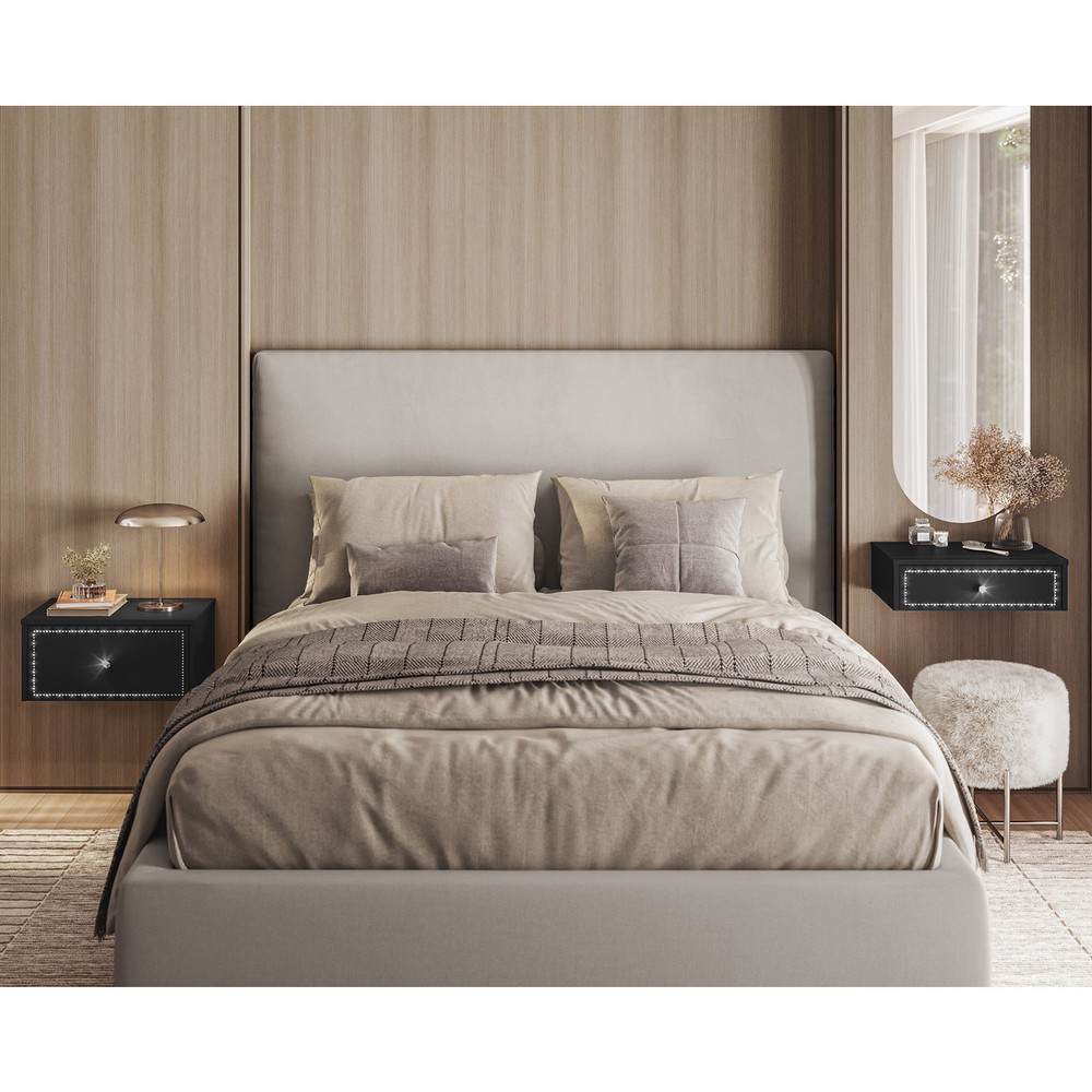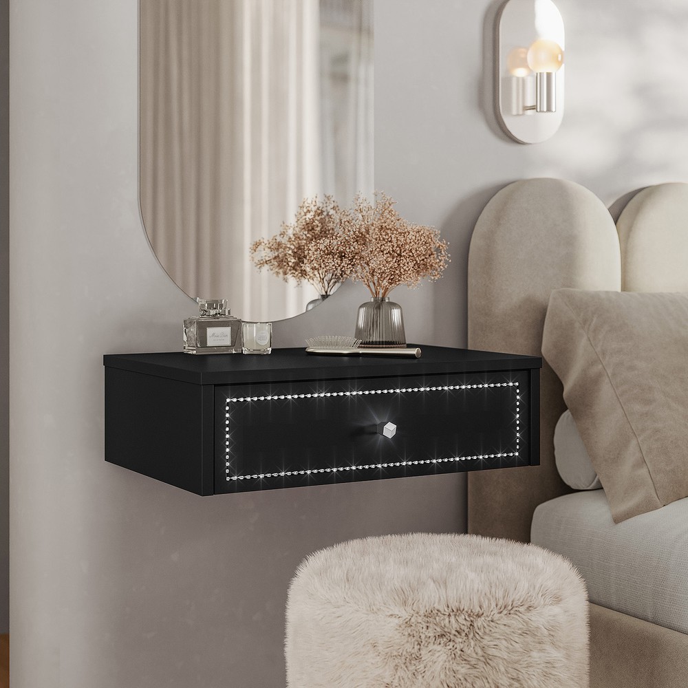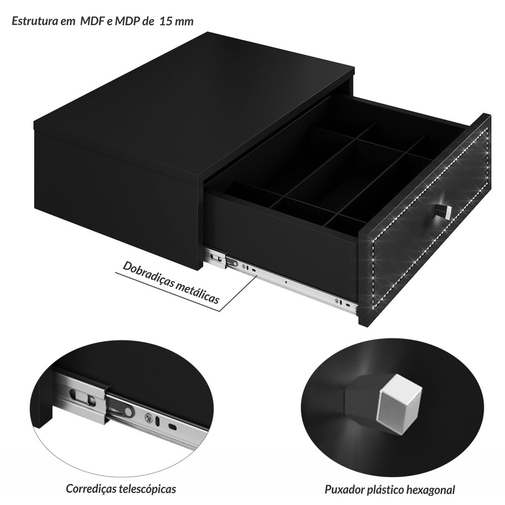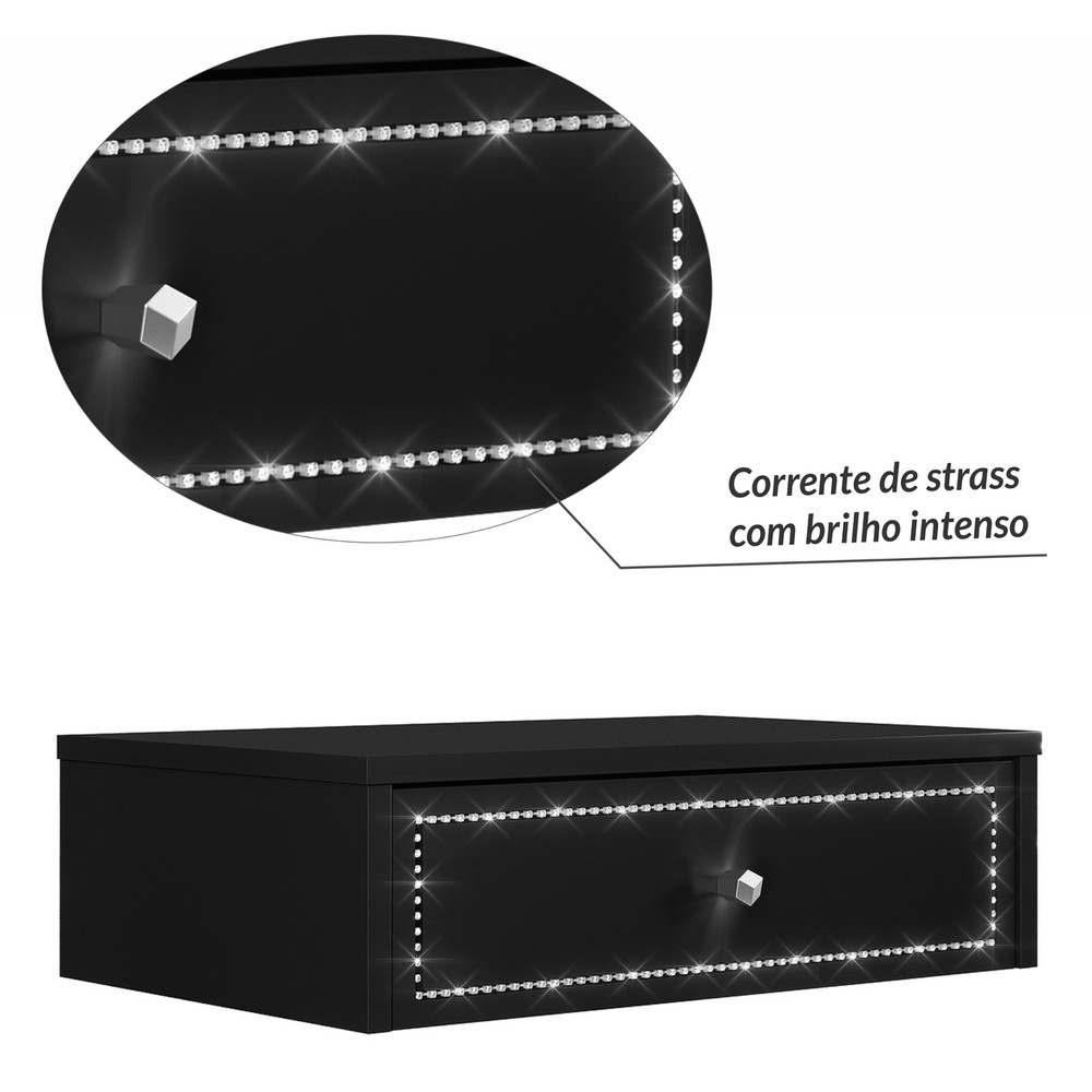 A Penteadeira Suspensa Strass é um produto com um design moderno, inspirado no estilo italiano com um toque romântico e sofisticado. Possui um detalhe na gaveta com um friso preenchido com uma corrente de pedras em strass dando um brilho intenso, o puxador é na forma hexagonal refletindo o seu brilho na peça. Ela é suspensa na parede e bem compacta onde você poderá colocar ao lado da cama como uma mesa de cabeceira, economizando espaço e ampliando seu ambiente. Possui uma gaveta com corrediças telescópicas e nela contém uma colmeia para você rechear com maquiagens, acessórios e produtos para beleza. Este produto mostra ao mesmo tempo sofisticação, delicadeza e uma elegância luxuosa para o seu ambiente.