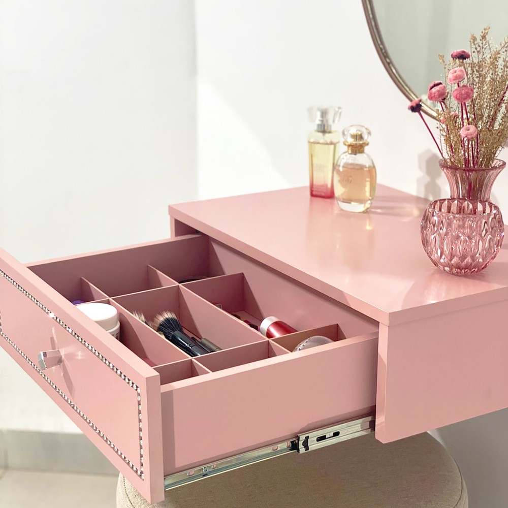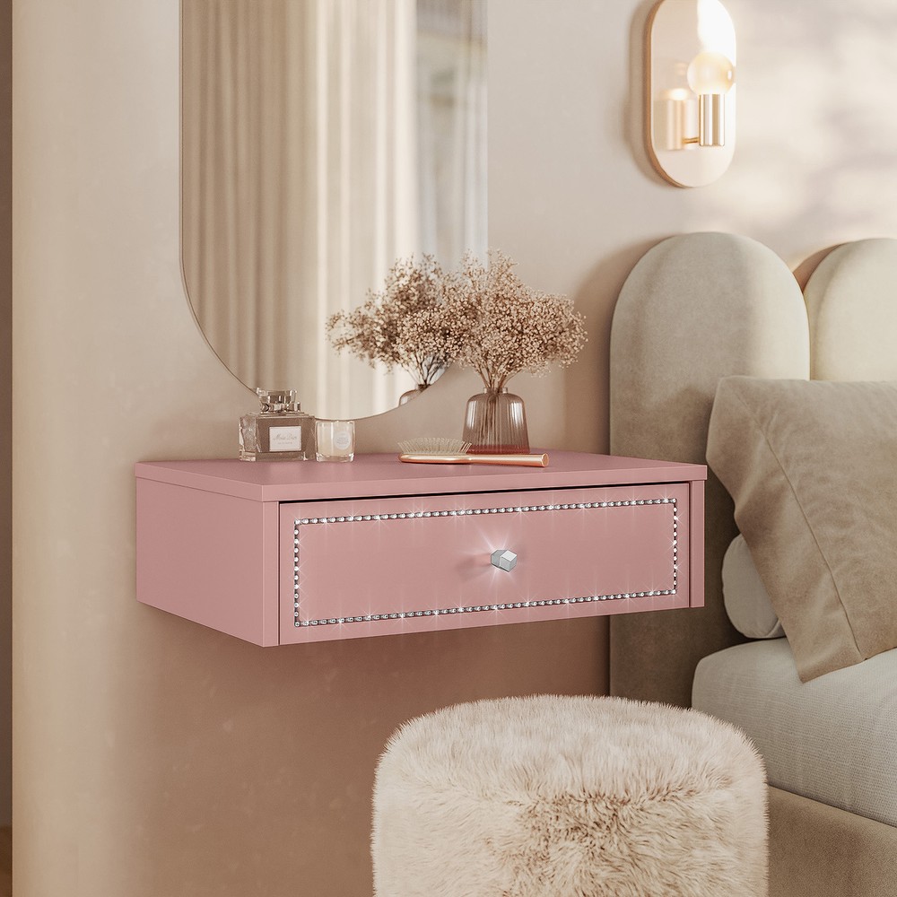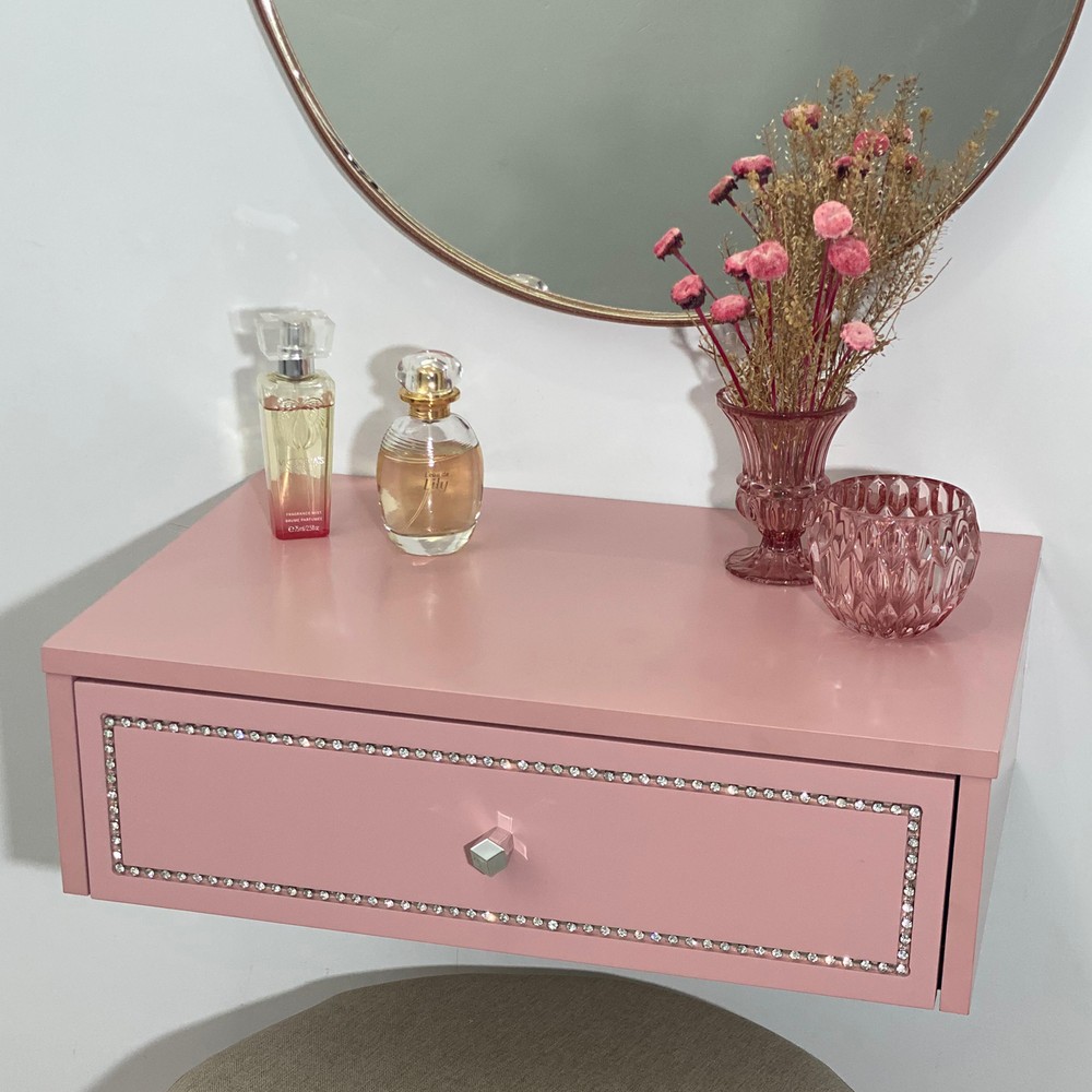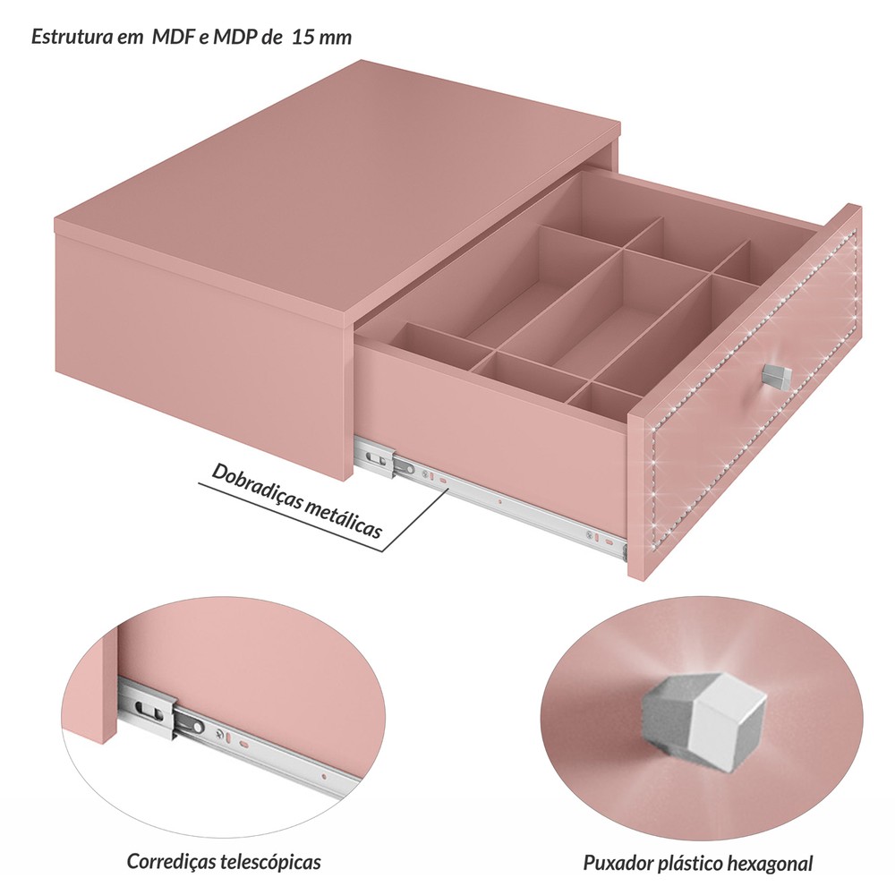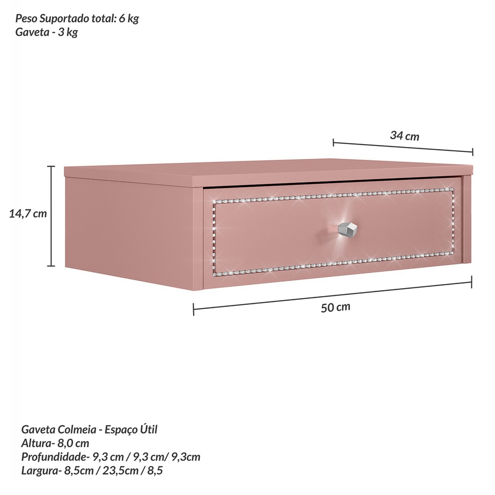 A Penteadeira Suspensa Strass é um produto com um design moderno, inspirado no estilo italiano com um toque romântico e sofisticado. Possui um detalhe na gaveta com um friso preenchido com uma corrente de pedras em strass dando um brilho intenso, o puxador é na forma hexagonal refletindo o seu brilho na peça. Ela é suspensa na parede e bem compacta onde você poderá colocar ao lado da cama como uma mesa de cabeceira, economizando espaço e ampliando seu ambiente. Possui uma gaveta com corrediças telescópicas e nela contém uma colmeia para você rechear com maquiagens, acessórios e produtos para beleza. Este produto mostra ao mesmo tempo sofisticação, delicadeza e uma elegância luxuosa para o seu ambiente.