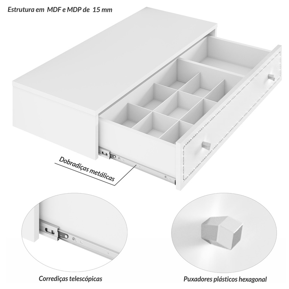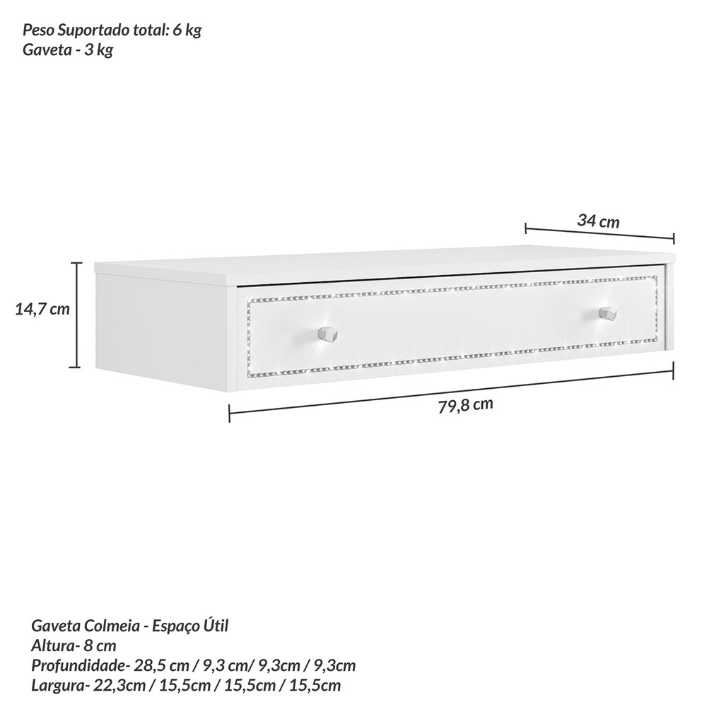 A Penteadeira Suspensa Strass é um produto com um design moderno, inspirado no estilo italiano com um toque romântico e sofisticado. Possui um detalhe na gaveta com um friso preenchido com uma corrente de pedras em strass dando um brilho intenso, os puxadores são na forma hexagonal refletindo o seu brilho na peça. Ela é suspensa na parede economizando espaço e ampliando seu ambiente. Possui uma gaveta com corrediças telescópicas e nela contém uma colmeia para você rechear com maquiagens, acessórios e produtos para beleza. Este produto mostra ao mesmo tempo sofisticação, delicadeza e uma elegância luxuosa para o seu ambiente.