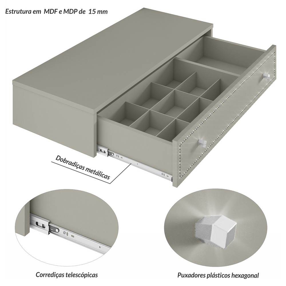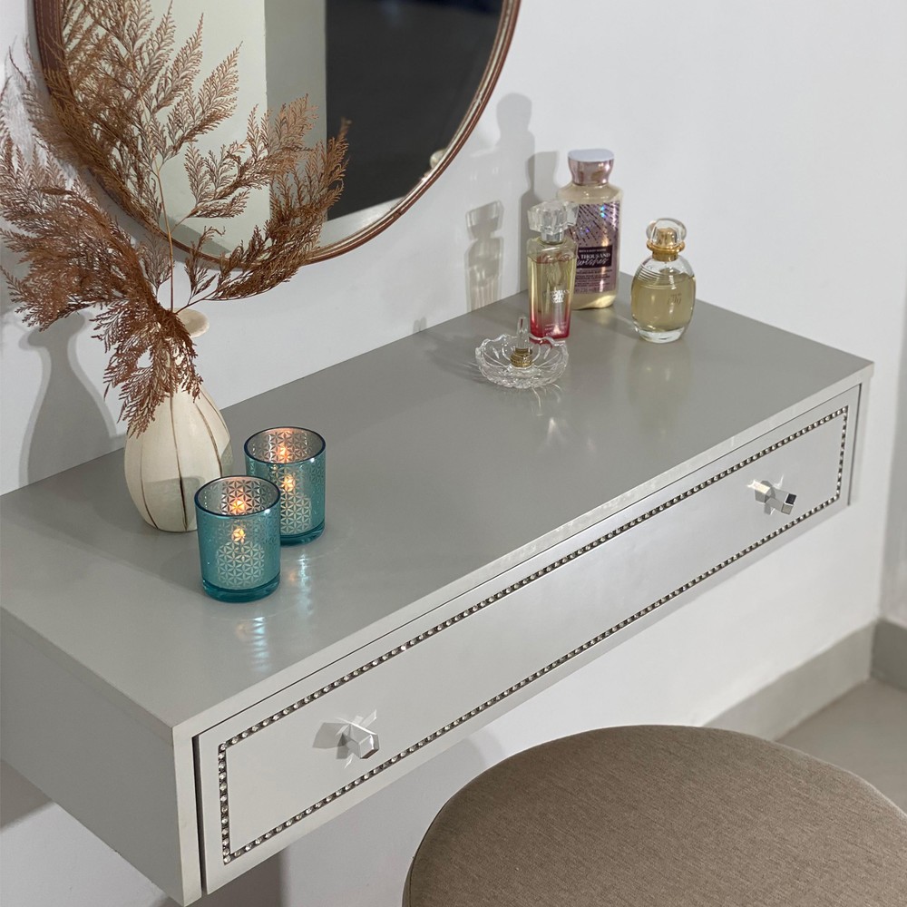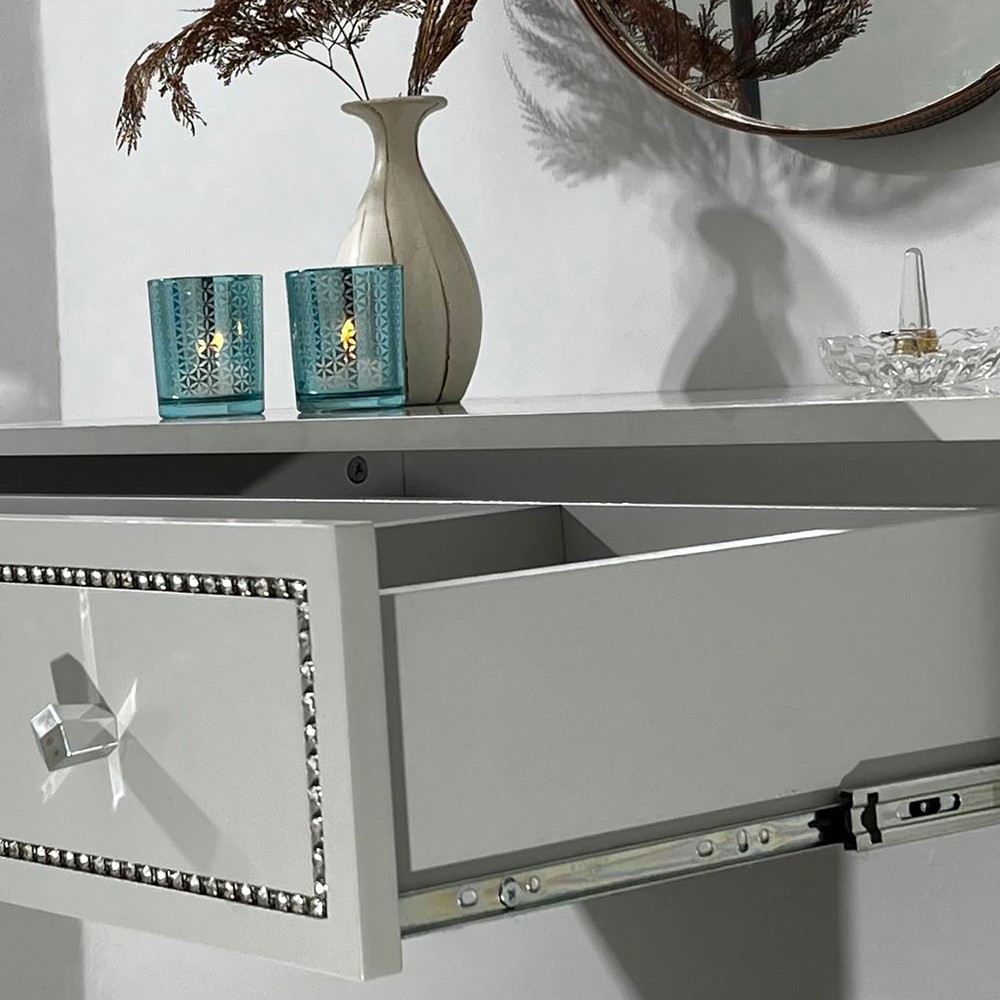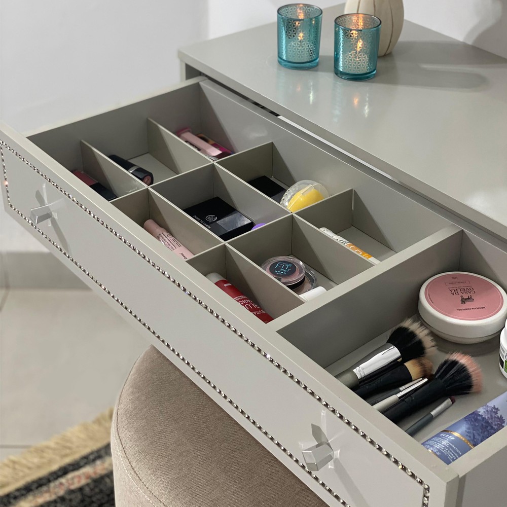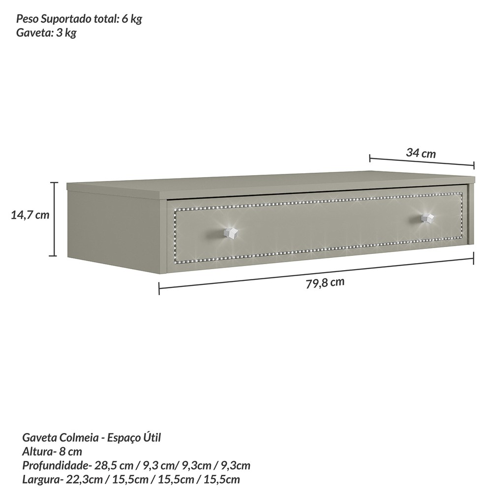 A Penteadeira Suspensa Strass é um produto com um design moderno, inspirado no estilo italiano com um toque romântico e sofisticado. Possui um detalhe na gaveta com um friso preenchido com uma corrente de pedras em strass dando um brilho intenso, os puxadores são na forma hexagonal refletindo o seu brilho na peça. Ela é suspensa na parede economizando espaço e ampliando seu ambiente. Possui uma gaveta com corrediças telescópicas e nela contém uma colmeia para você rechear com maquiagens, acessórios e produtos para beleza. Este produto mostra ao mesmo tempo sofisticação, delicadeza e uma elegância luxuosa para o seu ambiente.
