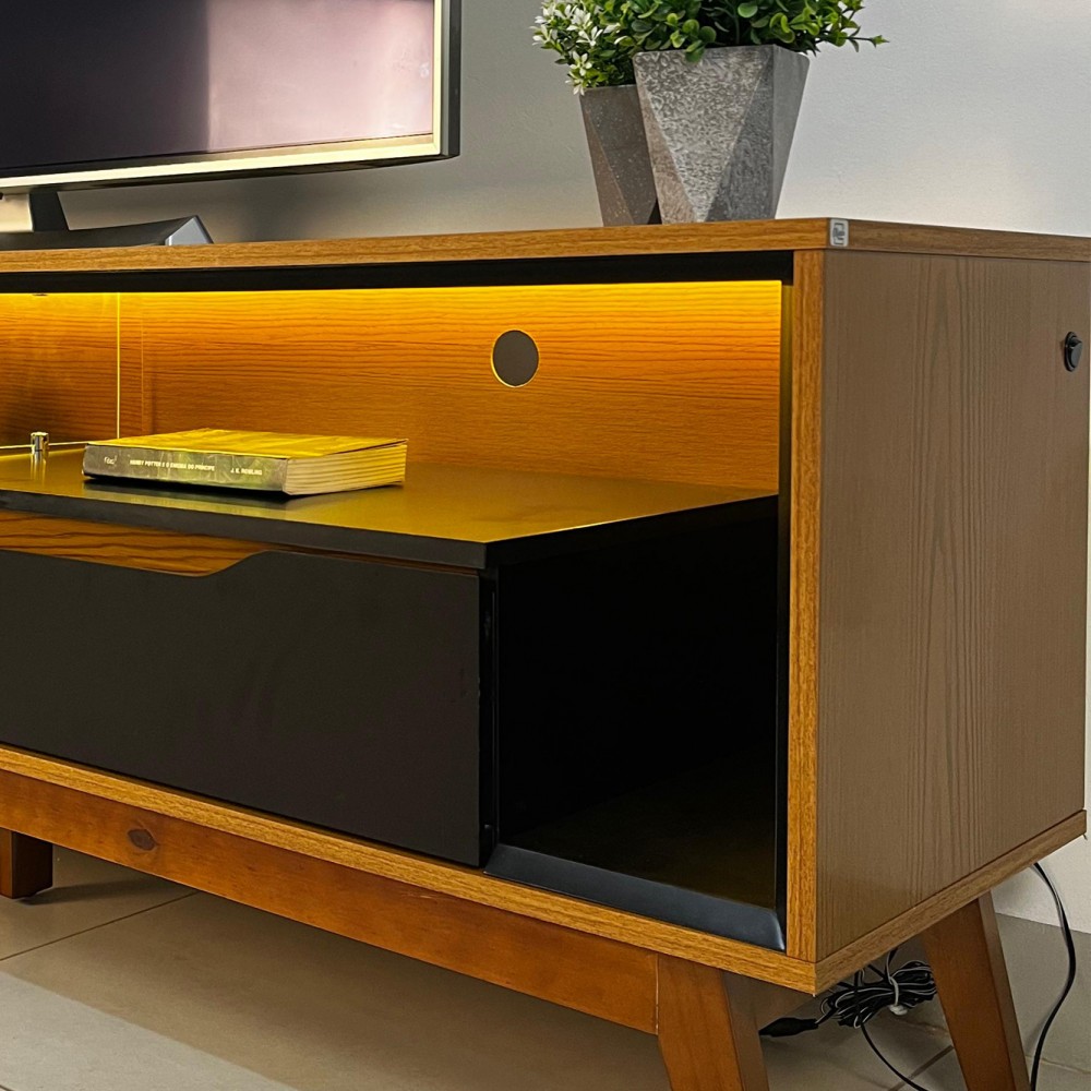 O Rack Retrô Led Duo é um produto com um design inovador e com diversidades de materiais, um dos seus diferenciais é um Kit de Neon em Led com luz quente no tampo superior, iluminando todo o Rack, inclusive refletindo esta iluminação em um divisor em vidro, valorizando-o e deixando o ambiente agradável e aconchegante. Nele possui à volta inteira interna peças em MDF com bordas chanfradas, reforçando e valorizando ainda mais o produto. Também apresenta um nicho com duas gavetas em MDF usinadas com pega como puxadores, corrediças telescópicas e passa fio para eletrônicos. Sua estrutura é em MDF e MDP de 15 mm e com uma estrutura dos pés em madeira maciça. É um produto com design de uma pegada contemporânea onde você personaliza seu ambiente deixando-o exclusivo.