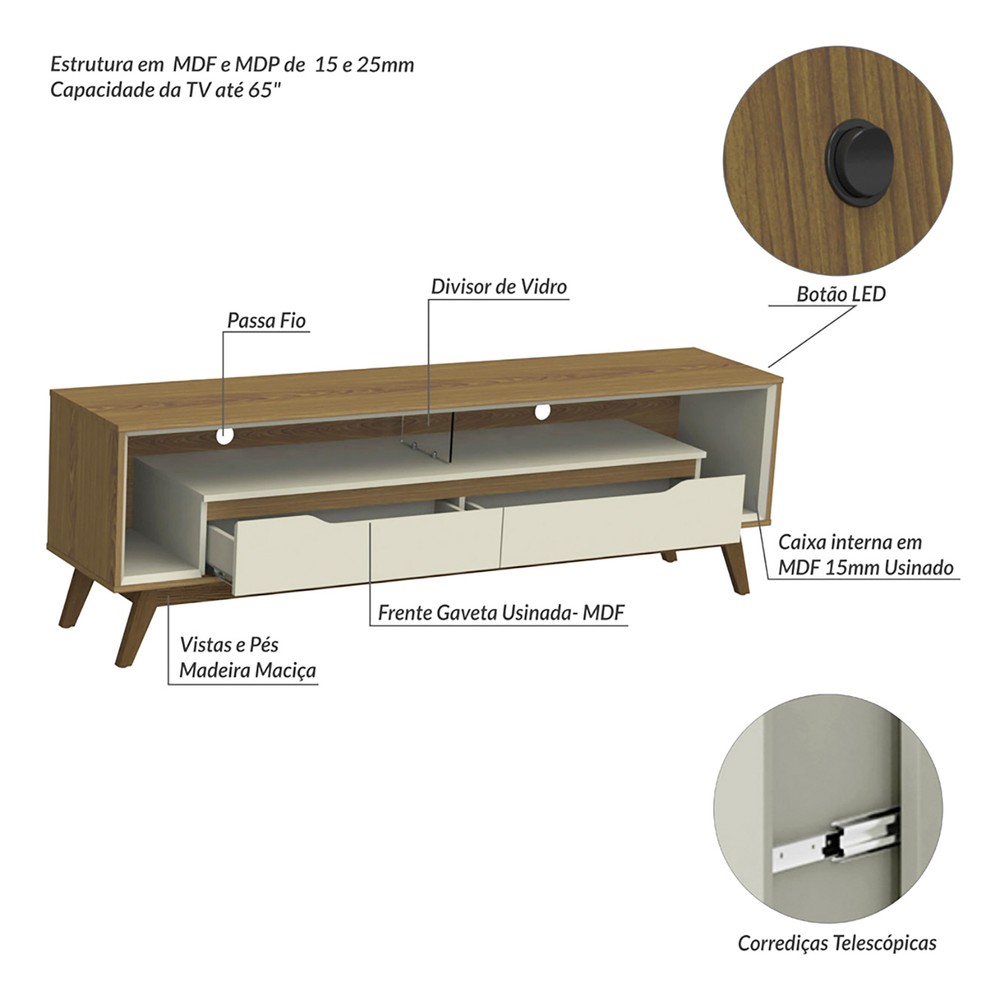 O Rack Retrô Led Duo é um produto com um design inovador, possui um Kit de Neon em Led com luz quente no tampo superior, iluminando todo o Rack . Possui um nicho com duas gavetas em MDF usinadas com pega como puxadores, corrediças telescópicas e passa fio para eletrônicos. Sua estrutura é em MDF e MDP de 15 mm e com uma estrutura dos pés em madeira maciça.