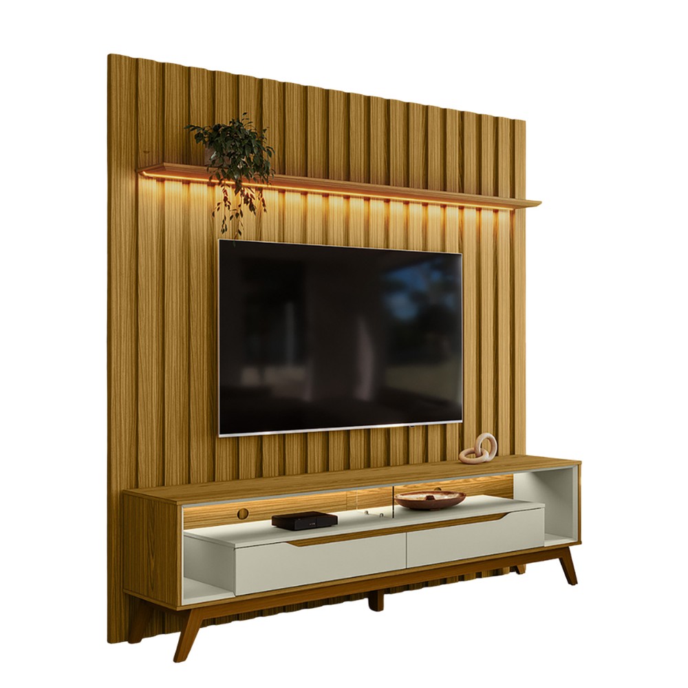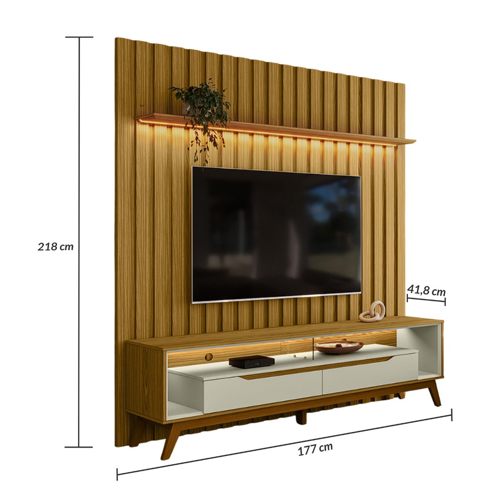 O Painel Ripado London 177cm é um produto com um design no estilo ripado. A sua estrutura é em MDF e MDP de 15 e 25 mm, possui uma prateleira superior de 25mm onde apresenta um led com luz quente deixando Painel iluminado e um passa fio para TV.
