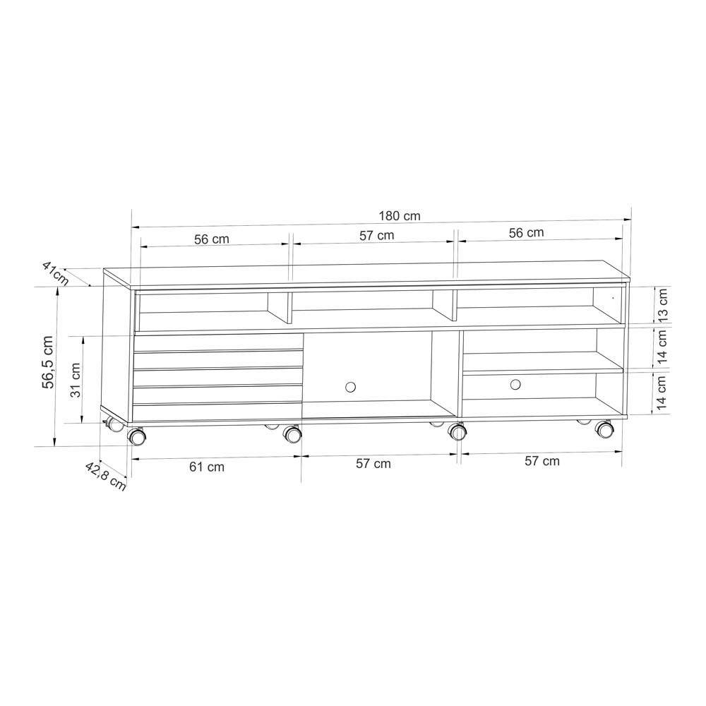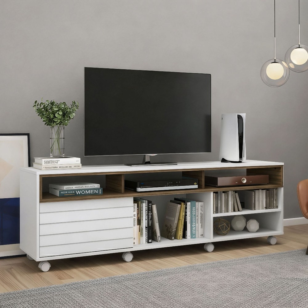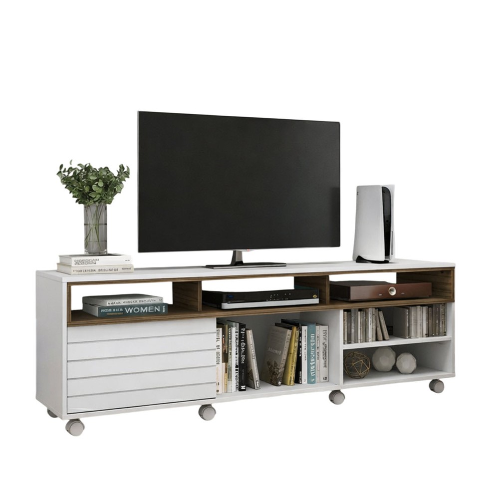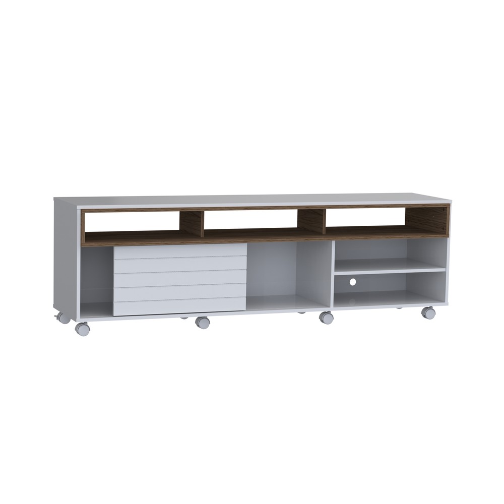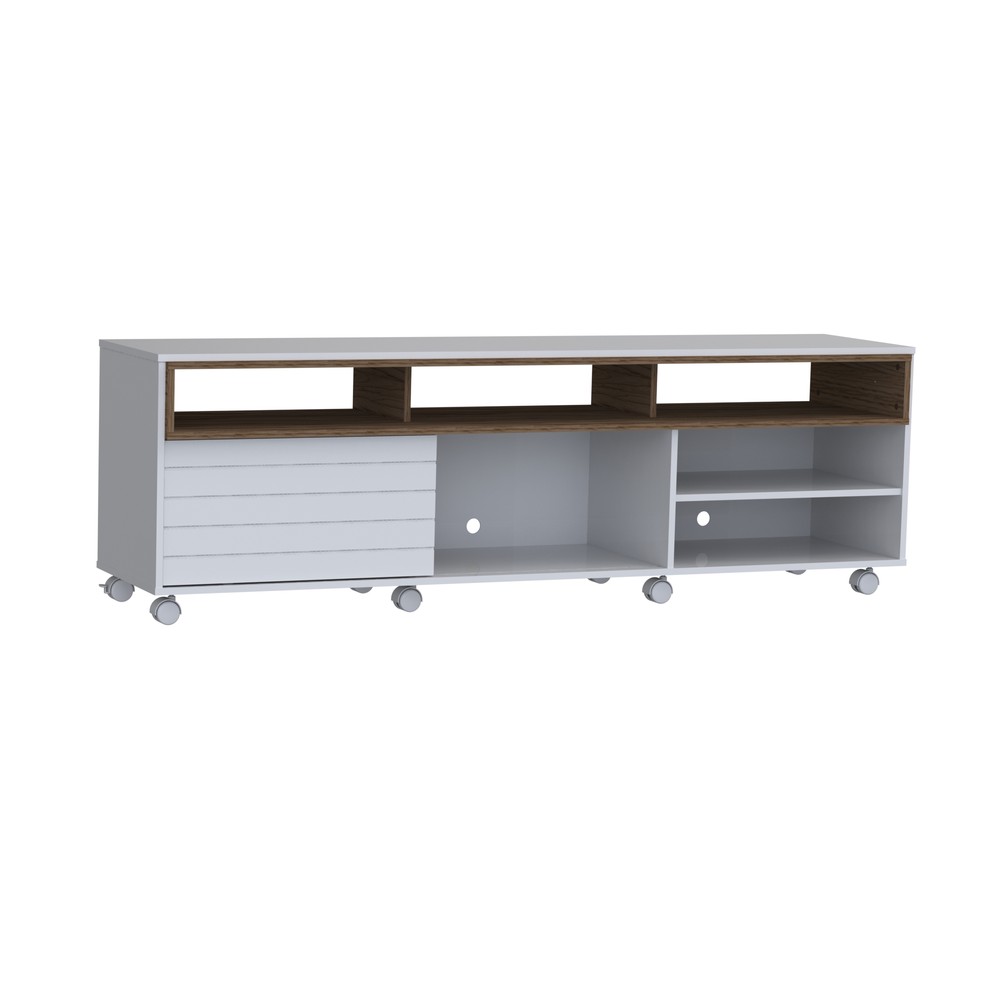 Rack Home Verona, possui 1 porta deslizante com frisos, possui compartimentos abertos para acomodação de diversos objetos e 8 rodízios. O Rack Verona é um móvel moderno e prático com uma dimensão ideal, possui rodízios facilitando a locomoção e limpeza da seu ambiente. Possui uma porta deslizante em MDF destacando detalhes em friso, espaço suficiente em seus compartimentos para colocar objetos e aparelhos eletrônicos. É feito em MDF E MDP de 15 e 25mm com acabamento em pintura UV.
