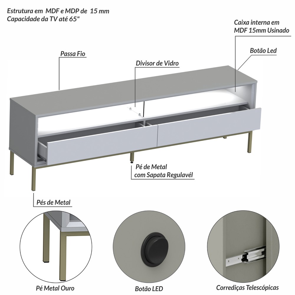 O Rack Ind. Led Fusion é um produto com um design industrial para quem gosta de um estilo mais urbano e contemporâneo, um dos seus diferenciais é um Kit de Neon em Led com luz quente no tampo superior, iluminando todo o Rack, inclusive refletindo esta iluminação em um divisor em vidro, valorizando-o e deixando o ambiente agradável e aconchegante. Nele possui à volta inteira interna peças em MDF com bordas chanfradas, reforçando e valorizando ainda mais o produto. Também apresenta um nicho suspenso com duas gavetas com corrediças telescópicas e passa fio para eletrônicos. Sua estrutura é em MDF e MDP de 15 mm e com uma estrutura dos pés em metal. É um produto com design de uma pegada industrial onde você personaliza seu ambiente deixando-o exclusivo.