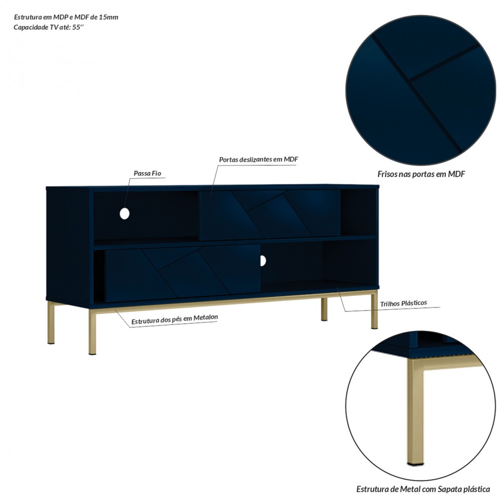 O Rack Industrial Tétris possui um design único e diferenciado, que transforma o seu ambiente em, um lugar super moderno e com uma pegada industrial, fabricado em MDP e MDF de 15 mm. destacando as portas deslizantes em MDF com desenhos de frisos contemporâneos, combinando com pés em metal preto ou ouro envelhecido dependendo da cor do Rack escolhida. Além de possuir dois nichos para colocar objetos e eletrônicos, e um espaço ótimo para sua TV com passa fio.