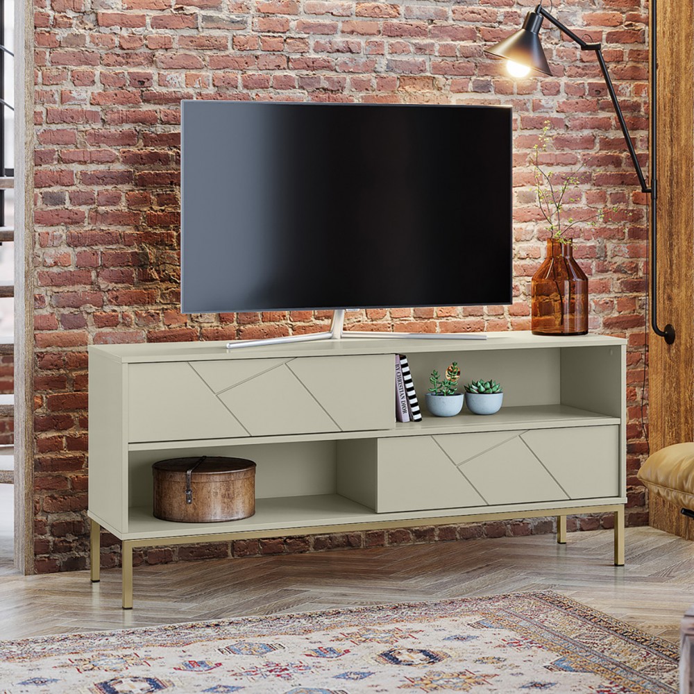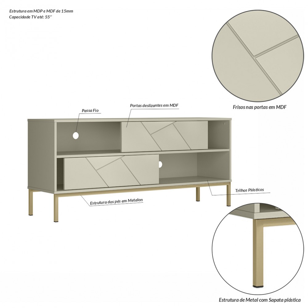 O Rack Industrial Tétris possui um design único e diferenciado, que transforma o seu ambiente em, um lugar super moderno e com uma pegada industrial, fabricado em MDP e MDF de 15 mm. destacando as portas deslizantes em MDF com desenhos de frisos contemporâneos, combinando com pés em metal preto ou ouro envelhecido dependendo da cor do Rack escolhida. Além de possuir dois nichos para colocar objetos e eletrônicos, e um espaço ótimo para sua TV com passa fio.