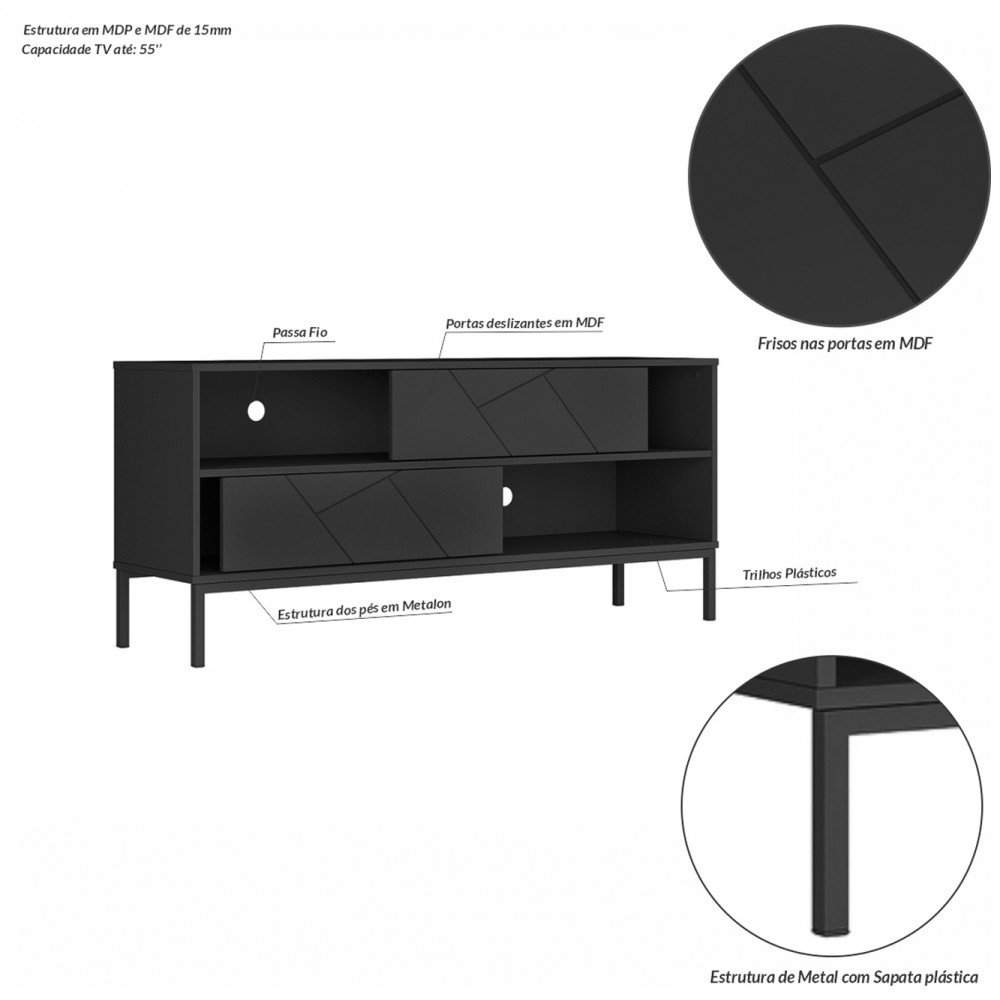 O Rack Industrial Tétris possui um design único e diferenciado, que transforma o seu ambiente em, um lugar super moderno e com uma pegada industrial, fabricado em MDP e MDF de 15 mm. destacando as portas deslizantes em MDF com desenhos de frisos contemporâneos, combinando com pés em metal preto ou ouro envelhecido dependendo da cor do Rack escolhida. Além de possuir dois nichos para colocar objetos e eletrônicos, e um espaço ótimo para sua TV com passa fio.
