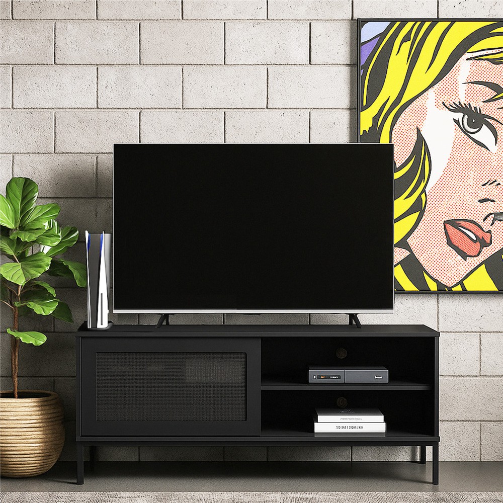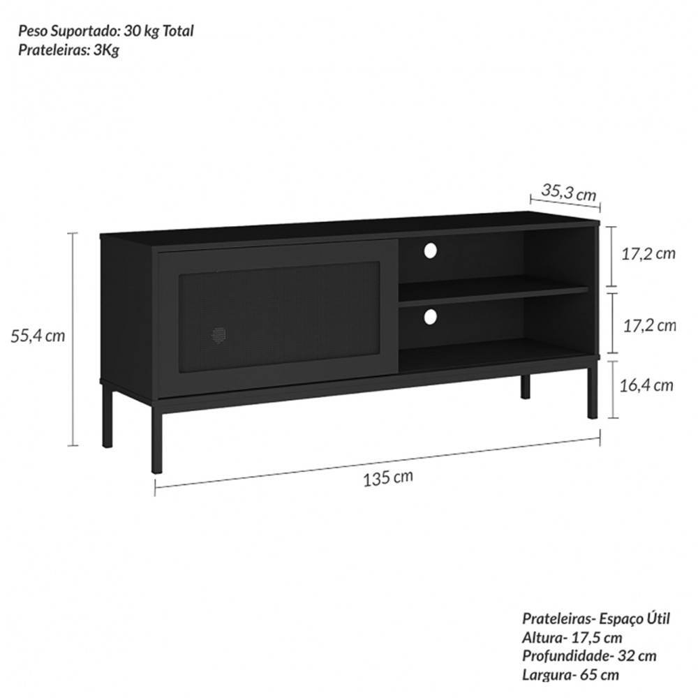 O Rack Industrial Palha Buriti é de MDP e MDF de 15 mm. No seu design há uma mistura de materiais que combinam entre si, destacando a telinha preta ou bege nas portas de MDF e o metal nos pés preto ou ouro envelhecido, dependendo da cor do Rack, deixando o produto arrojado e com muita personalidade. Possui dois nichos para colocar objetos e eletrônicos, uma porta deslizante com telinha e um espaço ótimo para sua TV com passa fio.